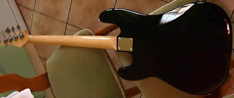 A gitár optikailag is fel lett dobva az Usa-ból rendelt gyári Fender króm pickup-fedőkkel, és egy kézzel gyártott fekete koptatólappal (megvan a 3 rétegű eredeti fehér is.) A vintage modified squierekre még ott ver egy kört, hogy a nyaka is gyönyörűen vastagon lakkozott.