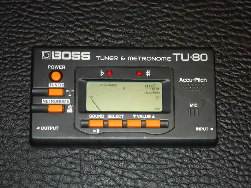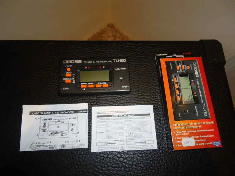 A gitárral együtt kínálom eladásra a Boss TU-80 típusú kromatikus hangológépet is, amely idővel karcos lett egy kicsit, de működése hibátlan (mind vonalbemenetben, mind mikrofon alapján). Megfelelő az akusztikus gitár hangolására.