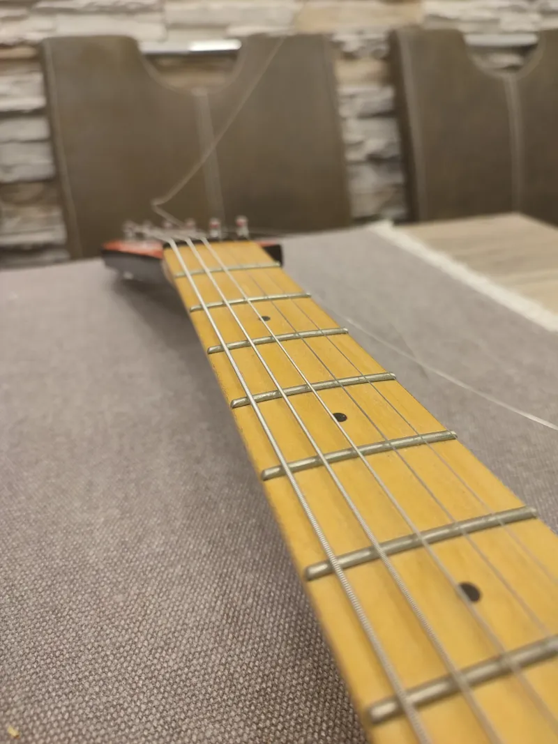 Eladó a címben említett átalakított gitár jó állapotban. Le lett festve, a single coil hangszedők, a hangszedő váltó poti és a tónus poti ki lett véve (ezek helyei közelről picit látszanak, próbáltam fotózni) és kapott egy EMG 81 humbucker hangszedőt.