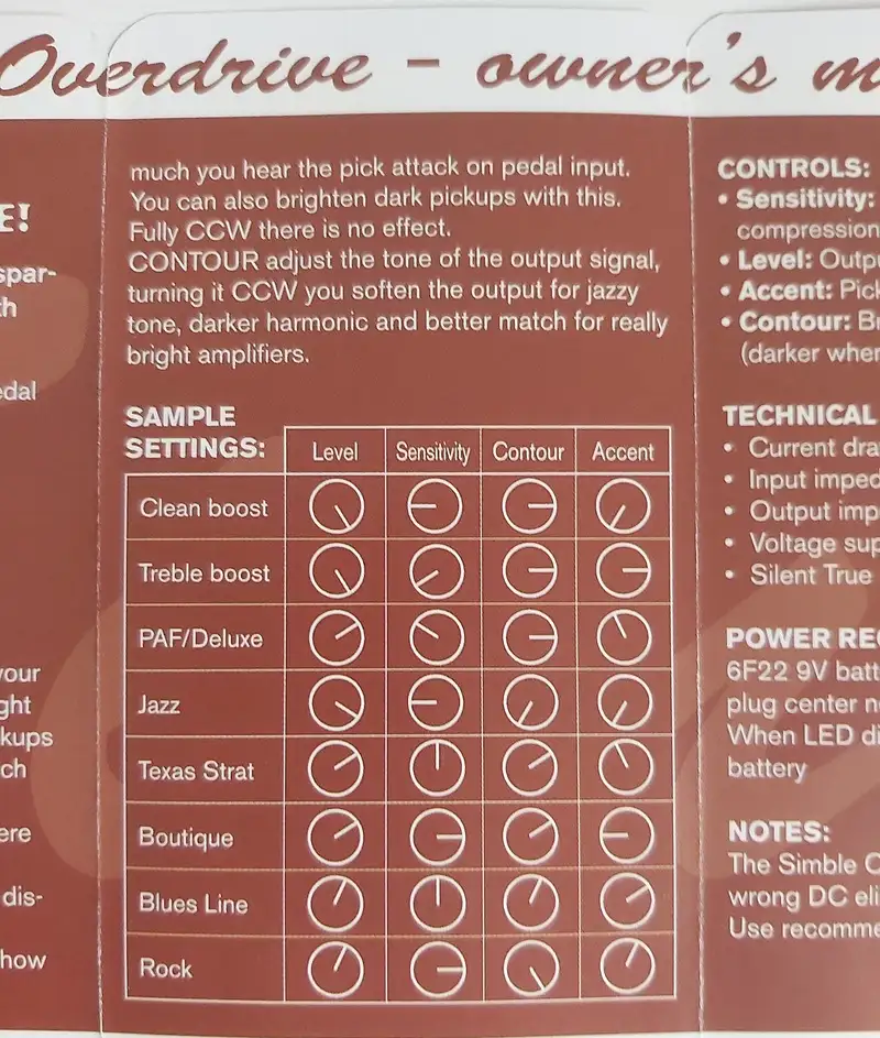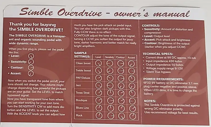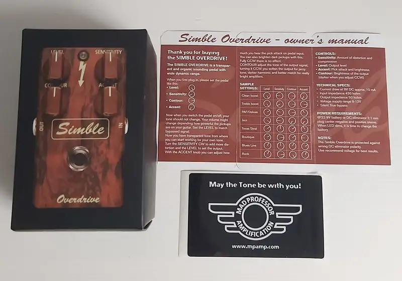 A Mad Professor Simble Overdrive egy transzparens és organikus hangzású torzító pedál, rendkívül széles dinamikatartománnyal. Természetesen organikus a hangzása, felülmúlhatatlan pengetési érzékenységgel, a csöves erősítőkre jellemző kompresszióval. A pedál hangzása rendkívül inspiráló. Működhet mint egy tiszta hangzású Booster, vagy mint egy hegyes Crunch torzítású overdrive, vagy mint egy éneklős overdrive, de a gitár hangaraktere mindenképp megmarad és azt nem színezi. A Simble Overdrive remekül működik single coil és humbucker hangszedőkkel is, de még basszusgitárral is! (teszt videók a linken)
