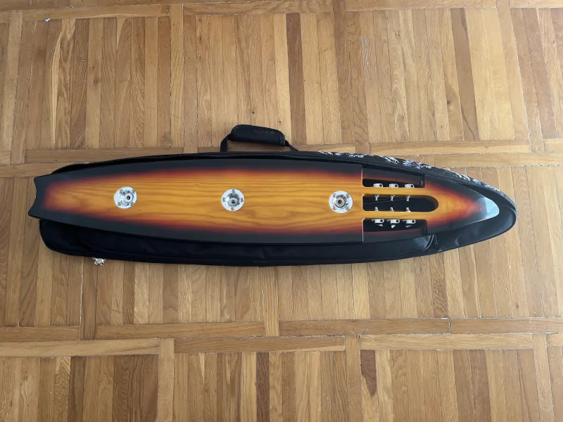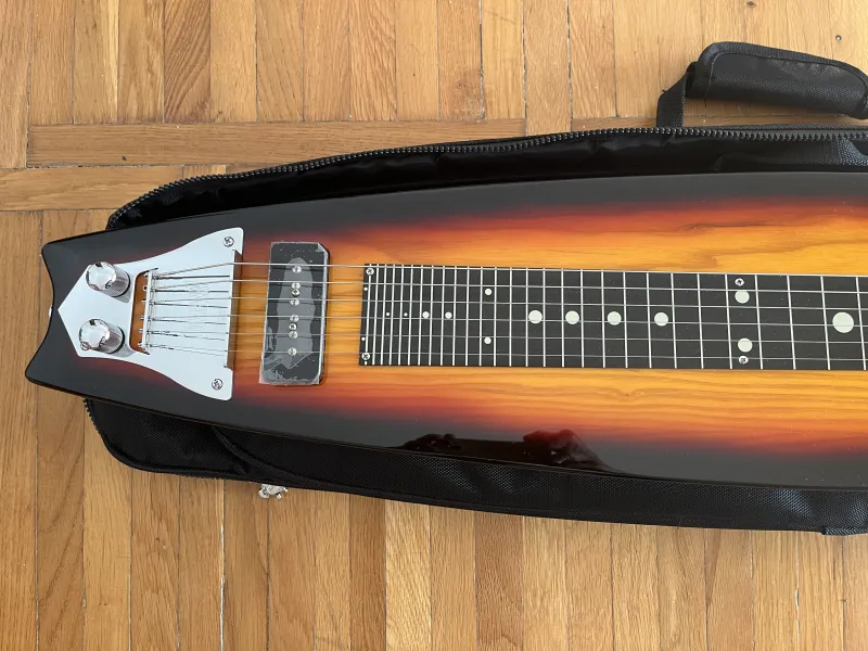 Hawaii lap steel gitár, szörfdeszka forma, amerikai mocsári kőris test, króm húrláb, és hangolókulcsok, P90 soap bar hangszedő, hangerő és hangszín szabályzók, 578mm menzúrahossz. Állítható lábak, 3-Tone Sunburst szín, tartozék 15 mm vastag béléssel rendelkező formatok.A hangszer keveset használt, újszerű, hibátlan, a hangszedőn még rajta van a gyári védő fólia. Ajándékba adok hozzá egy Dunlop üveg slide gyűrűt.