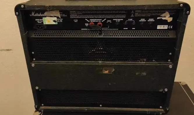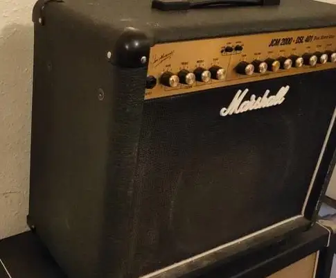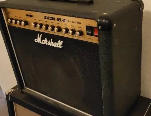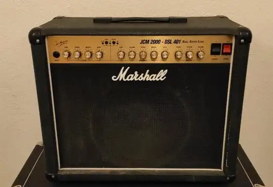 Marshall DSL 401 fullcsöves kombóm (40W, 2003, Made in England). 4x ECC83 előfokcső, 4x EL84 végfokcső, 3 csatorna, 1x 12`` hangszóró, lábkapcsolható csatornák, Master volume, 3 sávos EQ, FX Loop mix potméterrel, Accutronics zengető, DI kimenet.