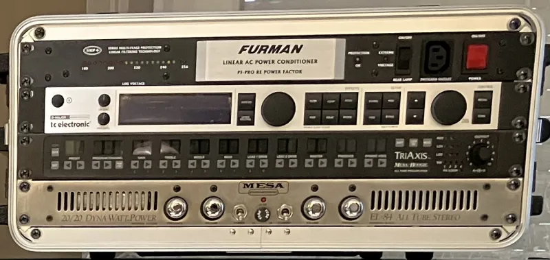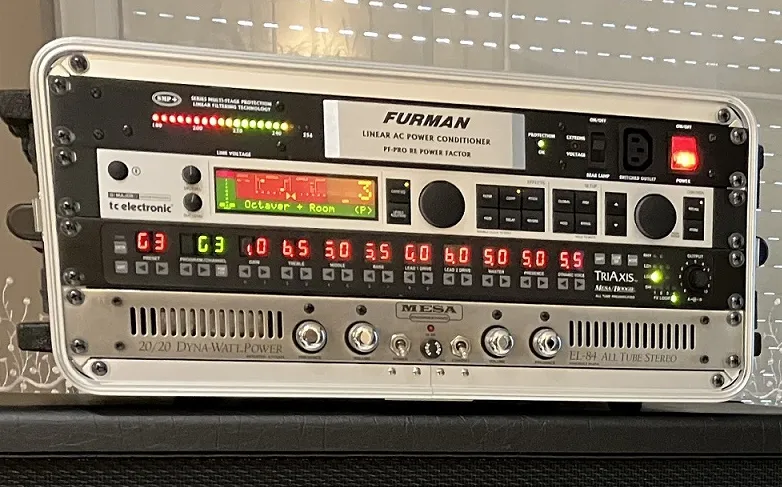 • Mesa/Boogie Triaxis V2 Pre-Amp: A legendás, programozható, teljesen csöves (5x12AX7) előfok. MIDI-zhető, minden idők egyik legsokoldalúbb és legjobb hangú előfoka. (Egyetlen apró észrevétel: a kijelzőn egy LED-szegmens (vonal) nem világít. Ez a hangzást és a programozhatóságot nem befolyásolja, de az árazásnál ezt figyelembe vettem.)