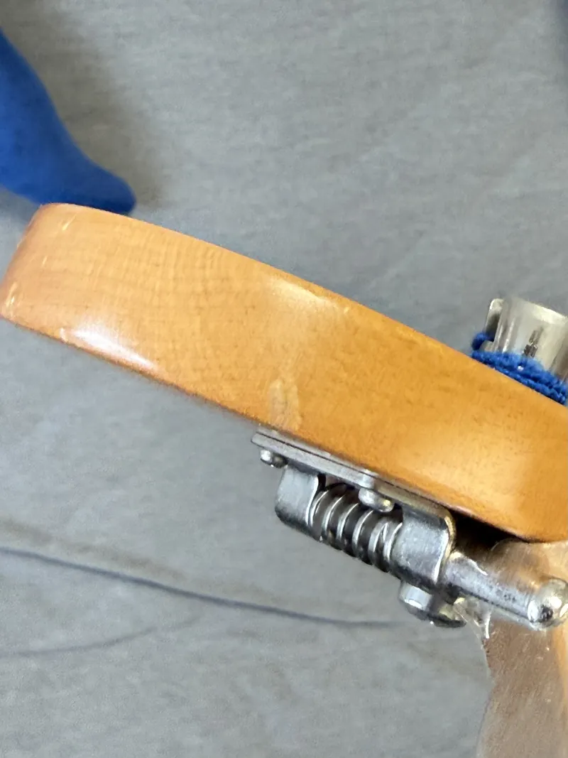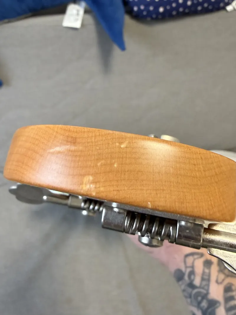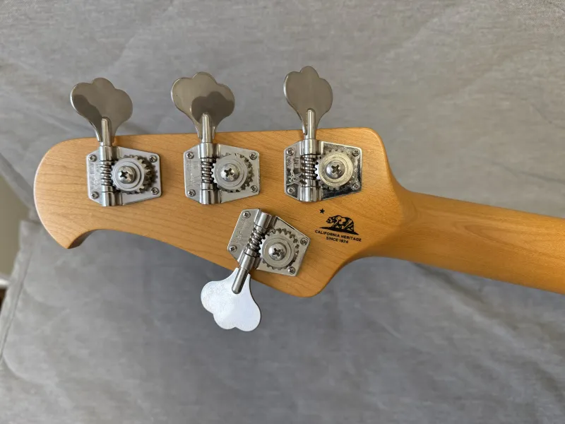 Két pici leverődés van a fején (ezeket fotóztam), ezen kívül csak mikrokarcok vannak rajta. Természetesen minden eredeti rajta. Nagyon keveset játszottam rajta, miután legutóbb síkolták a bundjait a Vintage-ben. Jelenleg 45-100-as Ernie Ball flatwound húrok vannak rajta.