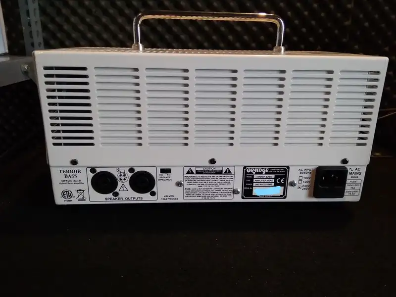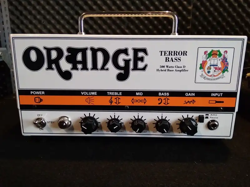 Orange Terror bass 500 Headbasszusgitár erősítő fej: Orange Bass Terror 500, csöves elő- és tranzisztoros végfok, Active/Passive váltó, 4 és 8 Ohmos impedanciaváltó, teljesítmény: 500 watts RMS, méret: 30 x 17 x 14 cm, súly: 5kg