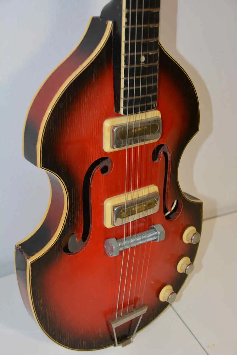 huendeskesEladó egy Orfeus hegedű formájú vintage gitár. Üreges testű. Valamikor a 70-es években készülhetett. A nyak egyenes, a bundok jó állapotban vannak, a húrtávolság jó, jól játszható a gitár, szép vintage hangja van. Minden jól működik a gitáron. Jack bemenetes. A gitár felületén a használatból adódóan leütődés, kopás van, de csak felületi. A húrláb jelenleg egy nagy csavar, anyákkal, de jól használható. Az eredeti húrláb nincs meg. Az egyik hangolókulcs műanyag része is hiányzott, a hangolókulcsra 1 dobókocka lett ragasztva, működik. A gitár nyakának alsó részén egy darab binding hiányzik. Budapesten a Széll Kálmán tér környékén, vagy megtekinthető, kipróbálható Budakeszin, és postázom is.