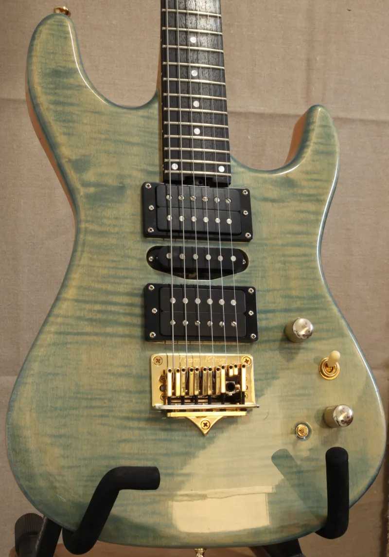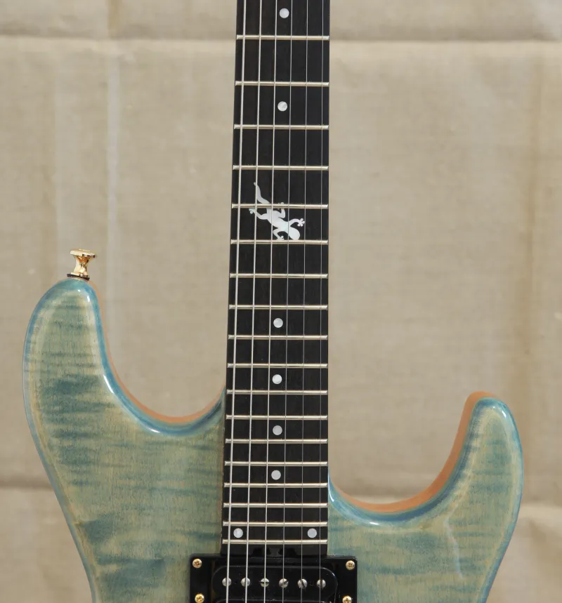 Minden porcikájában magas minőségű elemekből, egyedi megrendelésre, Prieger Tamás által készített gitár. 24,8 col menzúra, 24 érintő. Csavarozott juhar nyak, ébenfa fogólappal, gyöngyház pozíció jelölőkkel. Éger test, mintás jávor toppal. A test lakkozott. A nyak hátoldala lakkozatlan, olajos méhviaszos felületkezeléssel, ami selymes tapintást kölcsönöz a nyaknak. Húronként állítható réz felső nyereg. Különleges arany Trem-King tremoló, fix görgős papucsokkal ( játék közben rá lehet támaszkodni ) csak az alsó tőke fordul el. Arany PRS mini locking kulcsok, ébenfa gombokkal. Szögletes bobbinú PRS hunbuckerek. Nyaknál Vintage Bass, hídnál HFS. Középen egy SSL-1 Seymour Duncan egytekercse hangszedő. Az elektronika két pusg-push potit, két háromállású mikro kapcsolót és egy 3 állású pu váltót tartalmaz. Alapvetően egy klasszikus két humbuckeres gitár, háromállású pu váltóval áll rendelkezésre. Az egyik mikro kapcsolóval lehet az SSL-t ki-be kapcsolni, így lehetőség van arra, hogy csak a középső SSL szóljon, vagy együtt menjen a humbuckerekkel, illetve üzemen kívül maradjon. A másik micro kapcsoló - szintén három állással - a humbuckereket felezi. Közép állásban mindekét tekercs szól, a kétz szélsőben pedig vagy az első vagy a hátsó szól. A hangszín potival a híd hangszedő fázis fordítását lehet előhívni. A hangerő poti felső állásban a híd hangszedő a hangerő potit megkerüli, így csak a nyaki pu hangereje lesz szabályozható. Kiváló, sokoldalú hangszer. Testhez igazított Fender kemény tok is tartozék.Szállítás