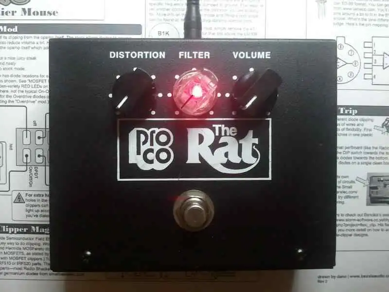 A jól megszokott RAT csak a belsejében a kötelező cserék meg lettek oldva a jobb hang érdekében , meg kapott egy szép ledes TONE potit és a DC aljzat is szabványosra lett cserélve.