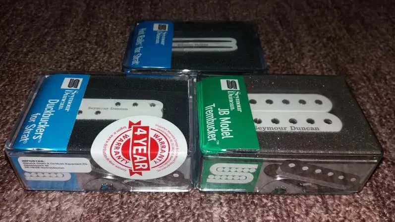 Vadonat új Seymour Duncan TB-4 JB Trembucker, SDBR-1n Duckbucker, SHR-1n Hot Rails hangszedő szett HSS pickup leosztású elektromos gitárokhoz.Mindhárom hangszedő magyarországi hangszerboltos vásárlás, számlával.