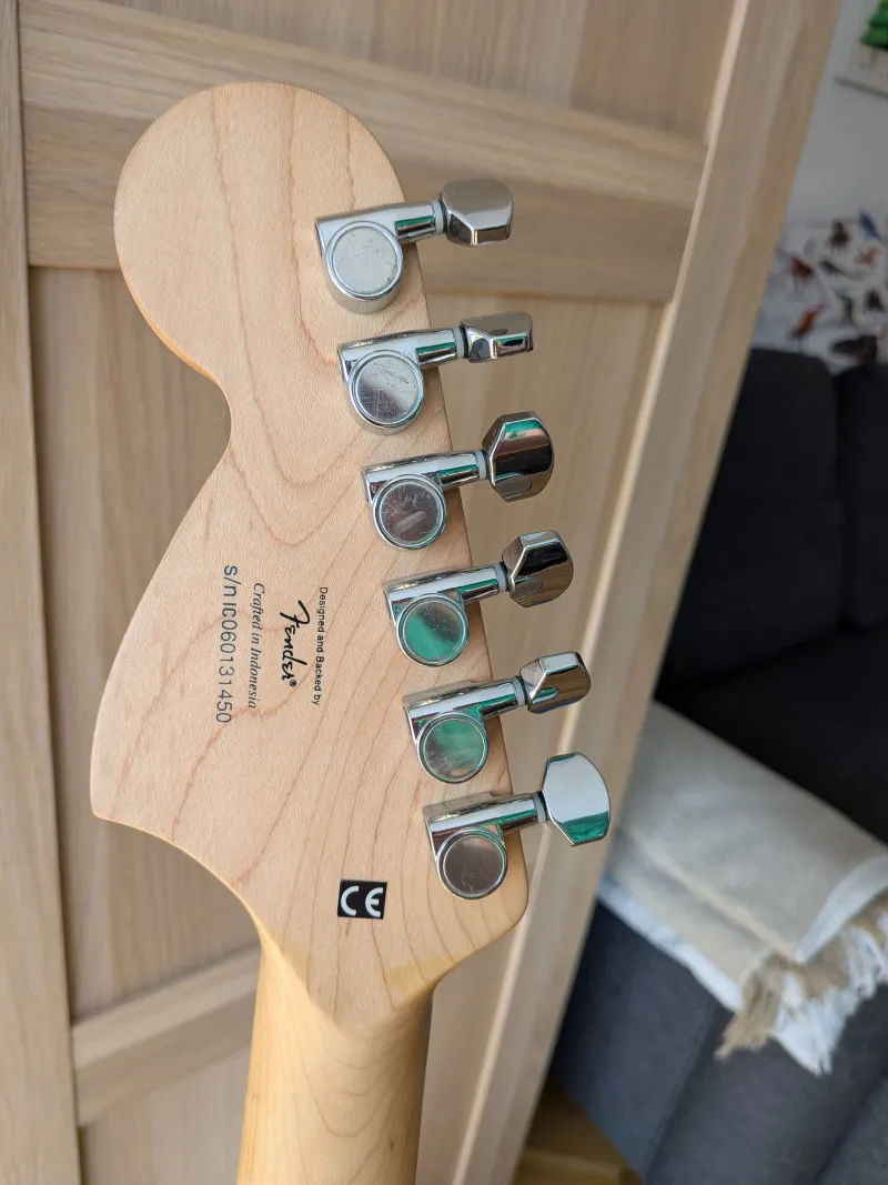 A gitárt 2021.09.06. napján vettem használtként, ám gyakorlatilag új állapotban (a gyári fóliák még mindenhol rajta voltak) a Vintage`52-ben. Ezt követően, 2021 novemberében, szintén a Vintage`52-ben elvégeztek rajta egy teljes beállítást, valamint készítettek rá egy csontnyerget, és a gyári koptatók helyett megkapta a hangszer a képeken látható tükörarany színű koptatókat, továbbá a potméter- és kapcsolósapkák is lecserélésre kerültek a gyári fehér helyett fekete színűre. Az összes eredeti, gyári alkatrész (tehát az első- és hátsó koptató, a potmétersapkák és a tremolókar) is megvan a mai napig fóliás állapotában, ezeket mind adom a gitárhoz.
