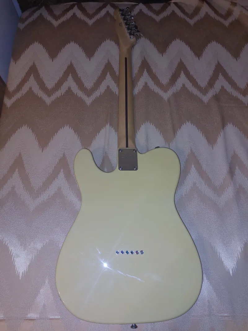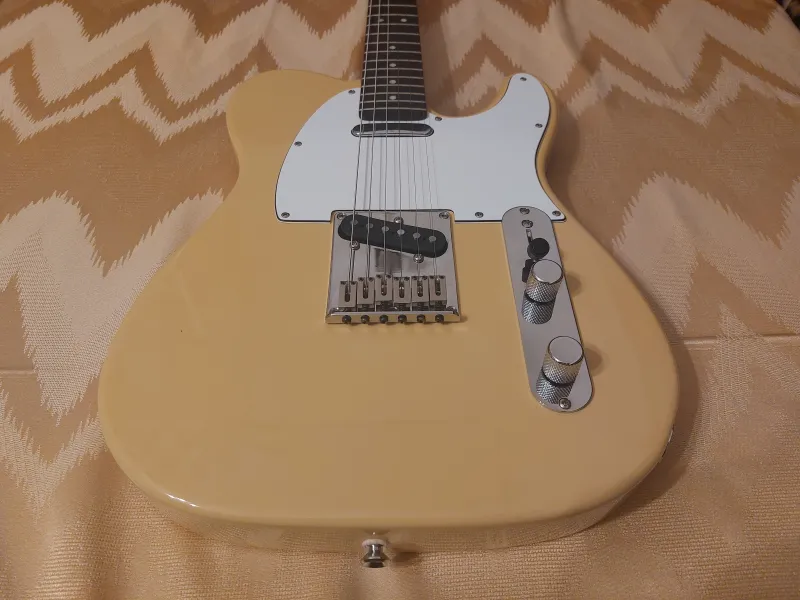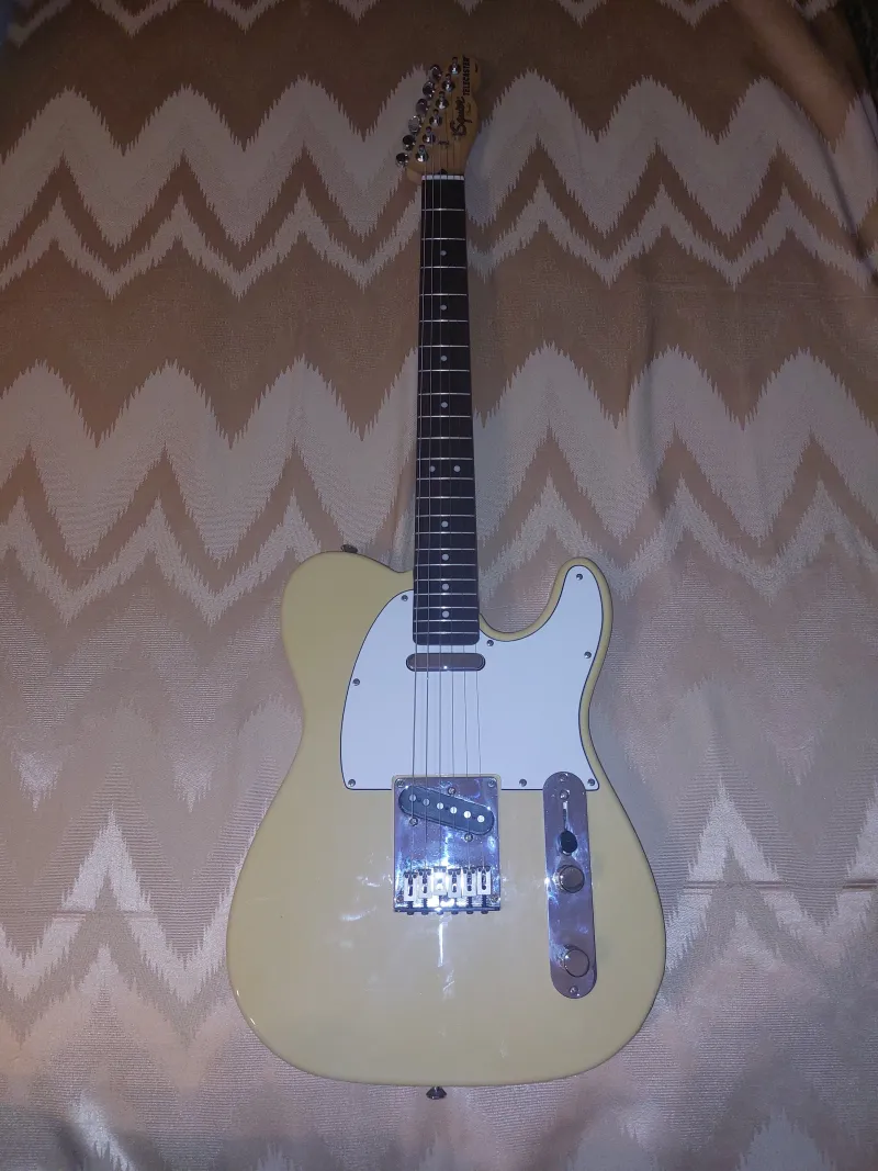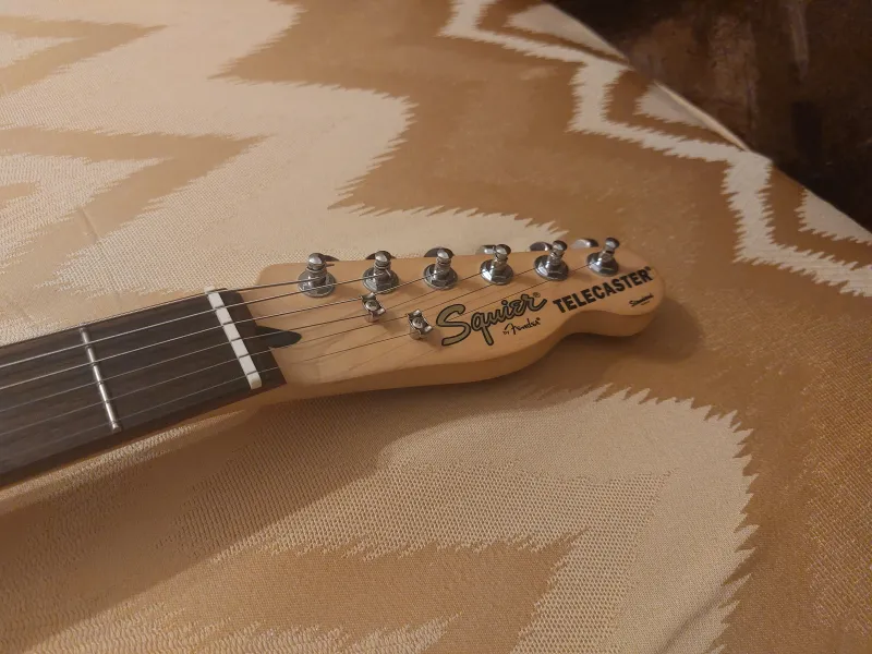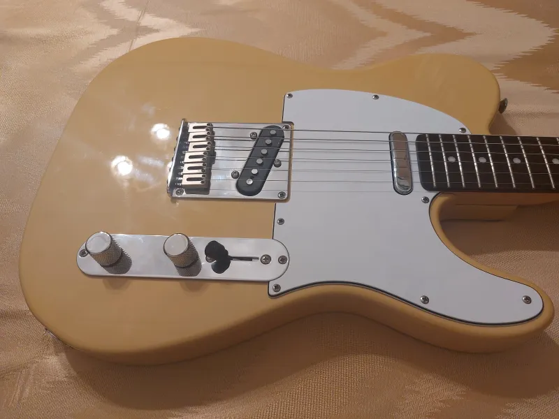 Squier 2008-as Standard Telecaster vintage blonde színben nagyon megkímélt állapotban. Hangoló kulcsok ki lettek cserélve 18:1-es Grover kulcsokra. Vastag puha tokot adok hozzá.Budapesten kipróbálható, megvehető, nem postázom. Csere nem.