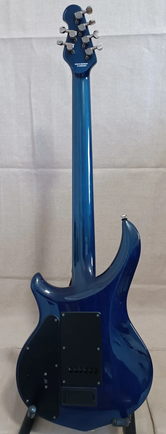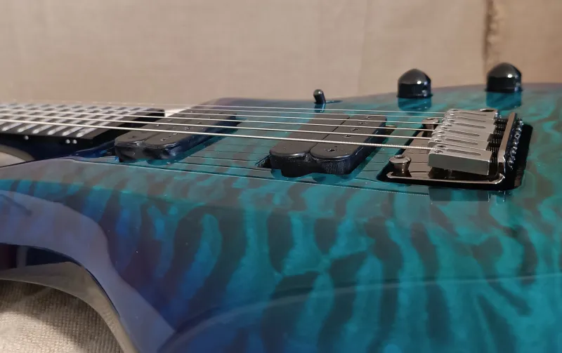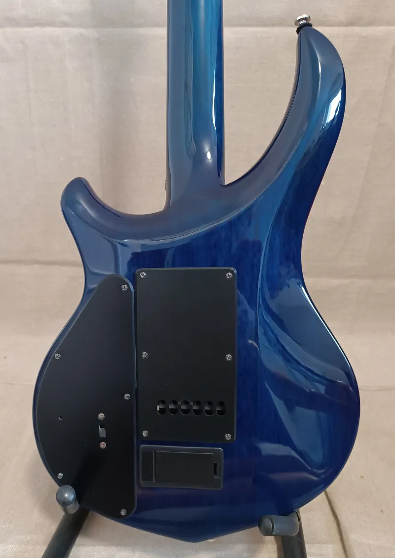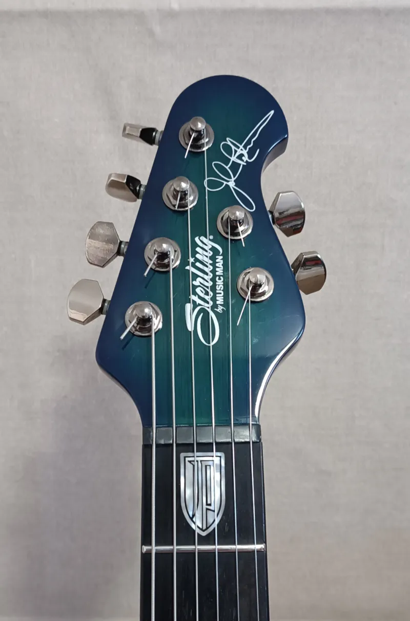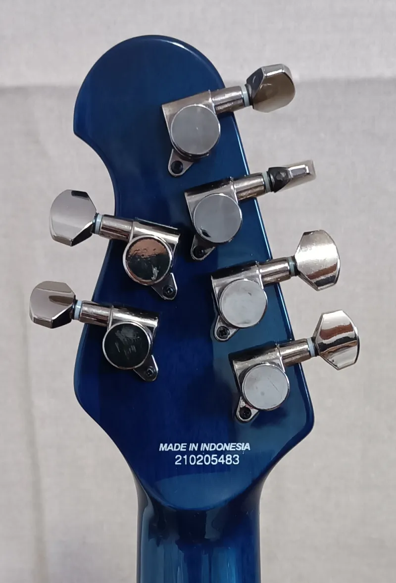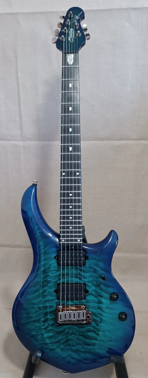 Kiváló állapotú, Sterling Majesty MAJ200XQM Cerulean Paradise gitár eladó. Nyatoh test, kagylós jávor top, három részes mahagóni nyak, ébenfa fogólap, pajzsos pozíció jelölők. Kétirányú nyakpálca, modern tremoló, satus kulcsok. 25,5˝ menzúra, fogólap 16˝ rádiusz, 24 rozsdamentes acél érintő. . DiMarzio LiquiFire és Crunch Lab hangszedők, speciális kapcsolással. A poti árok fedelén egy mikrokapcsolóval passzív módot is lehet választani. Egy trimmer potival lehet beállítani, hogy aktív módban 12 dB boost , vagy alaphangerő legyen. A push-push hangszín potival a hangszedők felezhetők. A push-push hangerő potival egy speciális kapcsolás érhető el. A hangerőt csak a nyaki hangszedőn lehet szabályozni, a híd hangszedő, oda kapcsolva teljes hangerővel szól. 3 kg súly. Sterling by Music Man Delux tok.Szállítás
