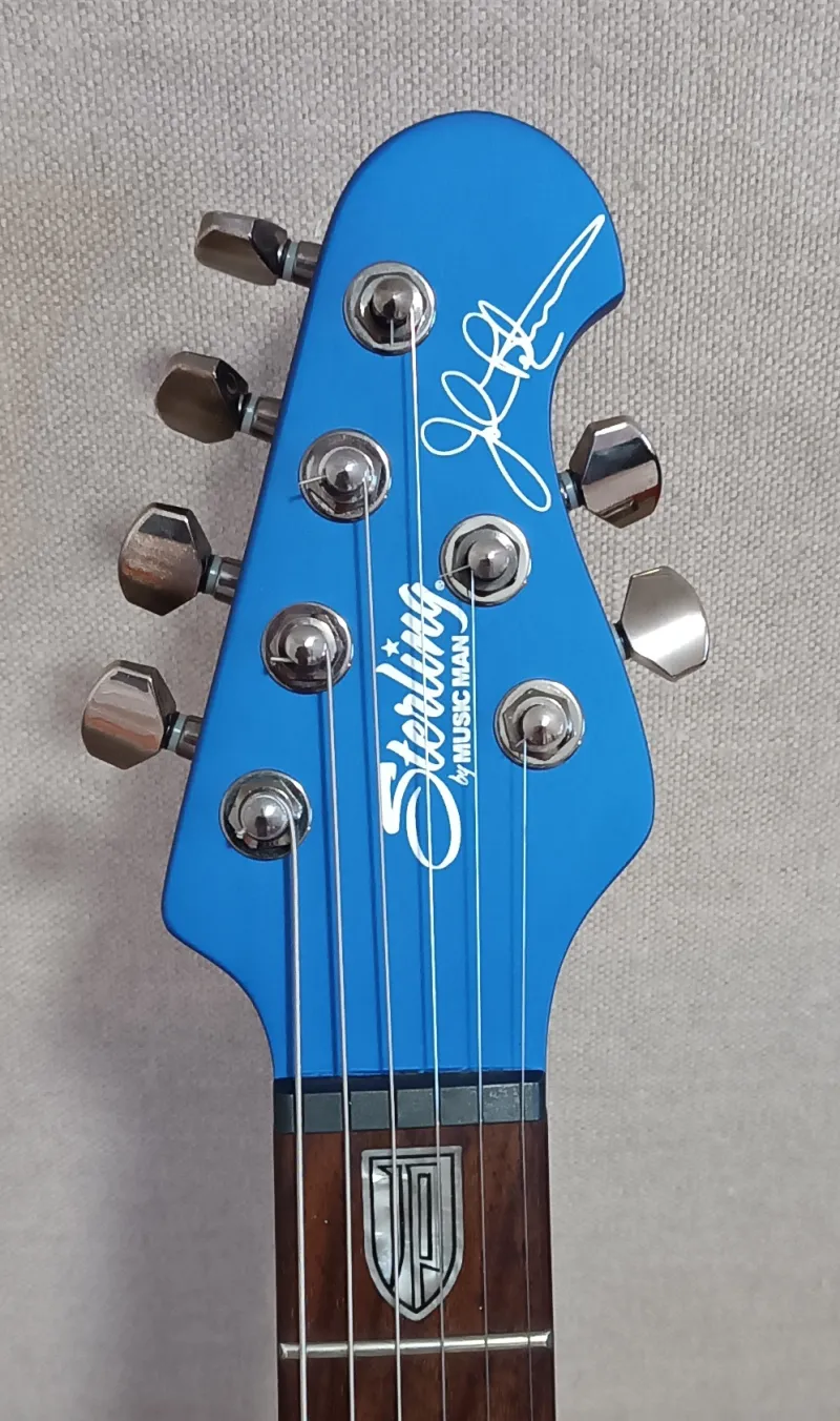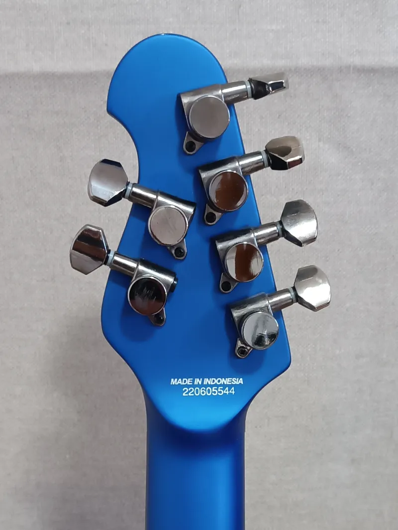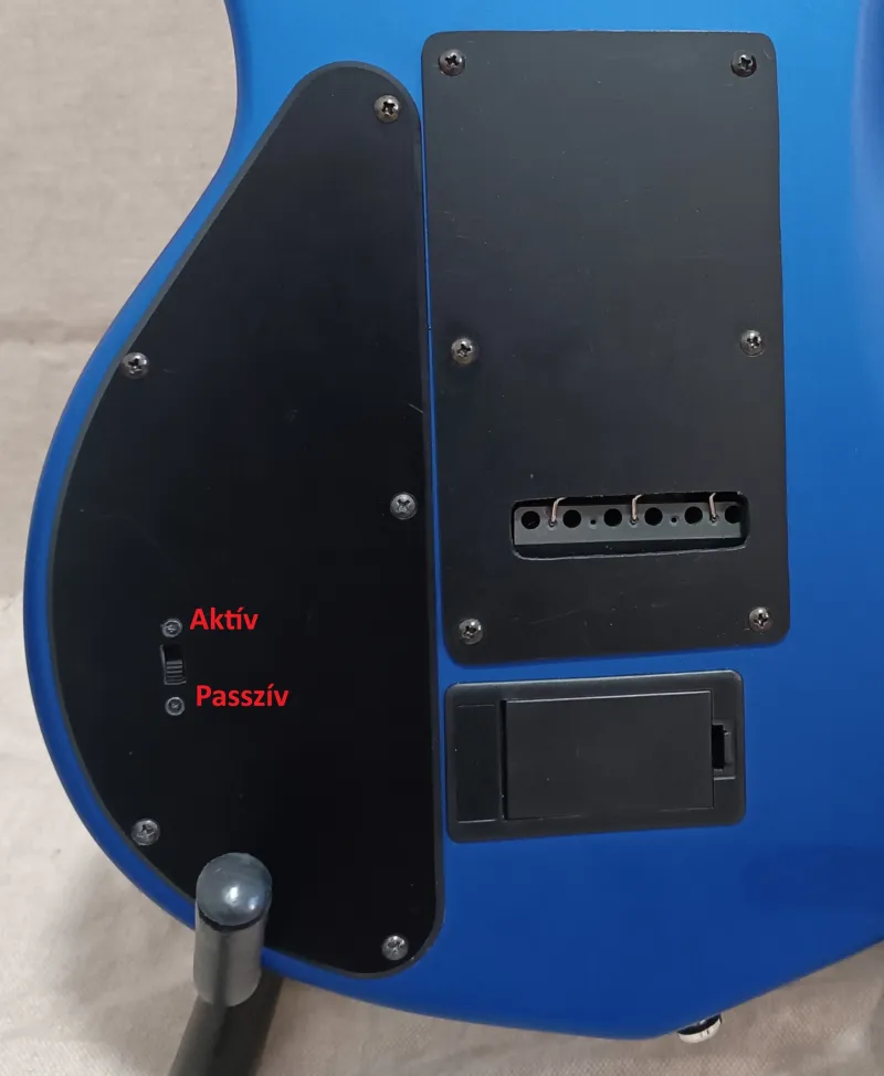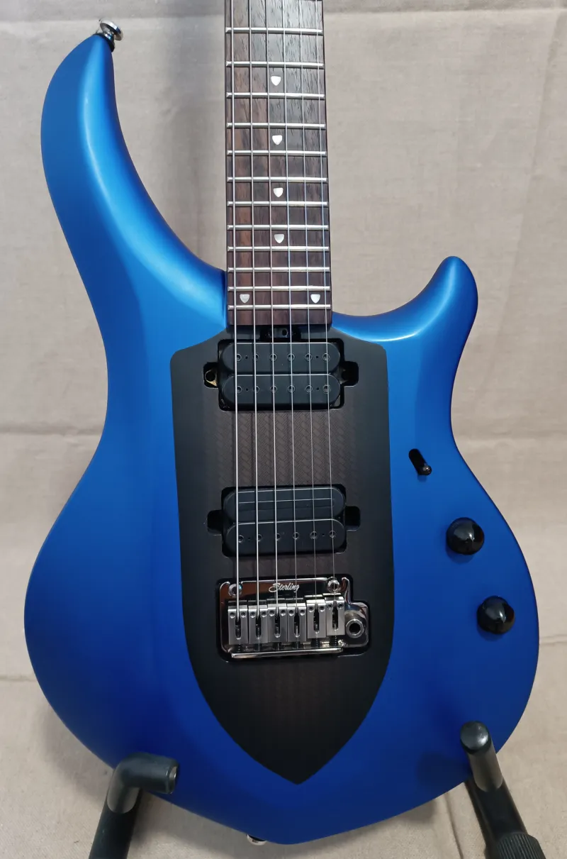 2020 júniusában készült MAJ100 SSP ,Siberian Sapphire, gitár Dimarzio hangszedőkkel. A nyaknál Dimarzio PAF Pro, a hídnál Dimarzio Crunch Lab van. Annak ellenére, hogy két passzív hangszedő van a gitárban, alaphelyzetben is a 12dB boostot biztosító aktív elektronikán keresztül megy a jel. A poti árok fedelén egy mikrokapcsolóval az aktív módról át lehet kapcsolni passzív módra. Azon túl , hogy így elem nélkül is lehet használni a gitárt, a kopasz hangszedők hangja kicsit más, eltűnnek az aktív elektronikára jellemző dinamaikai határok. Gyakorlatilag ez így egy másik gitár. A push-push hangszín potival a hangszedők mindkét módban felezhetők. A push-push hangerő potival - mint az eredeti kapcsolásban is van - a 12dB bosstot lehet bekapcsolni , termászítesen csak az aktív módban. Az átalakítással az olcsó potik helyére minőségi potméterek kerültek beépítésre. Kifogástalan érintők. Profin beállítható gitár, minden tartozékával együtt. 2,8 Kg súly. Sterling by Music Man Delux tok, gyári temolókar, gyári szerszámok. Igány esetén az eredeti hangszedőkkel, vagy mindkettővel. Pompás hangszer.Szállítás