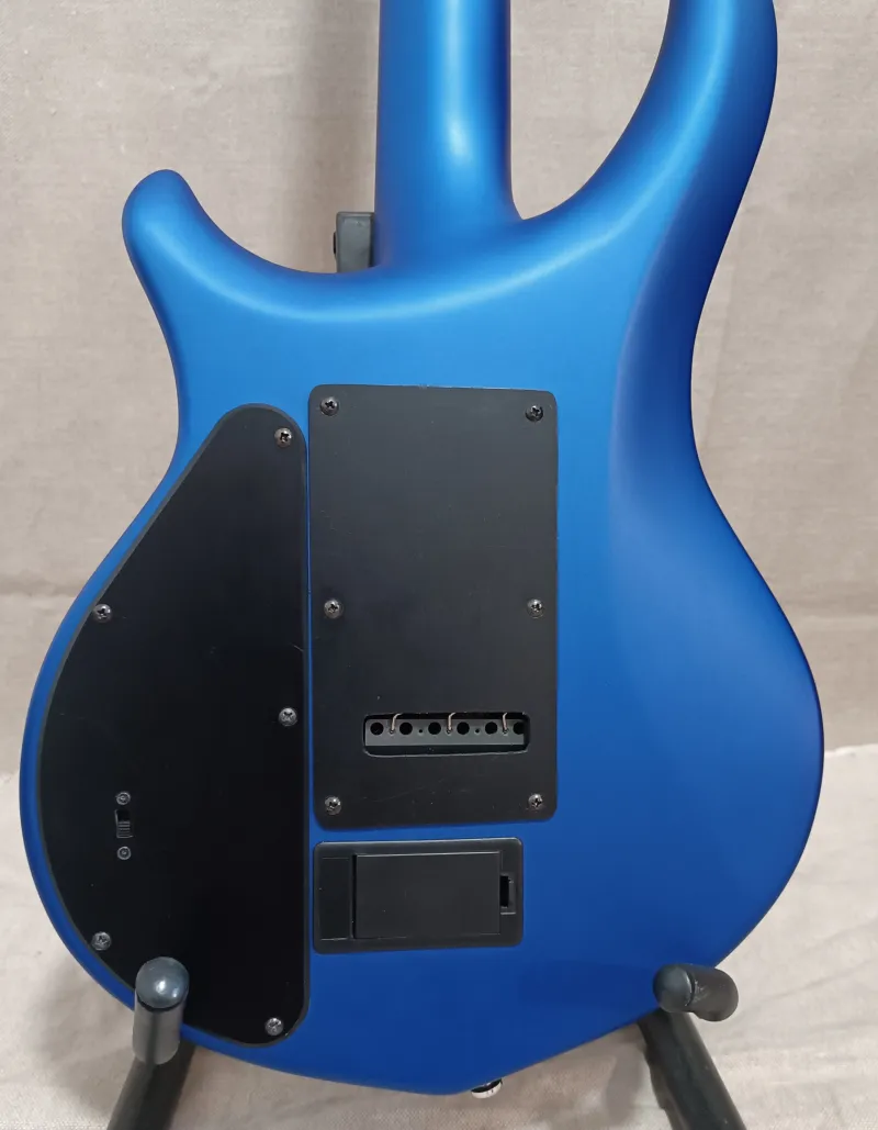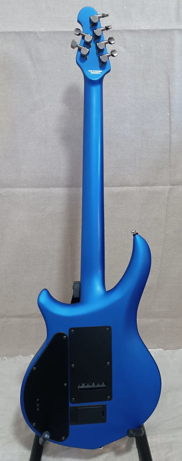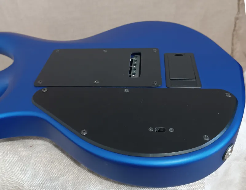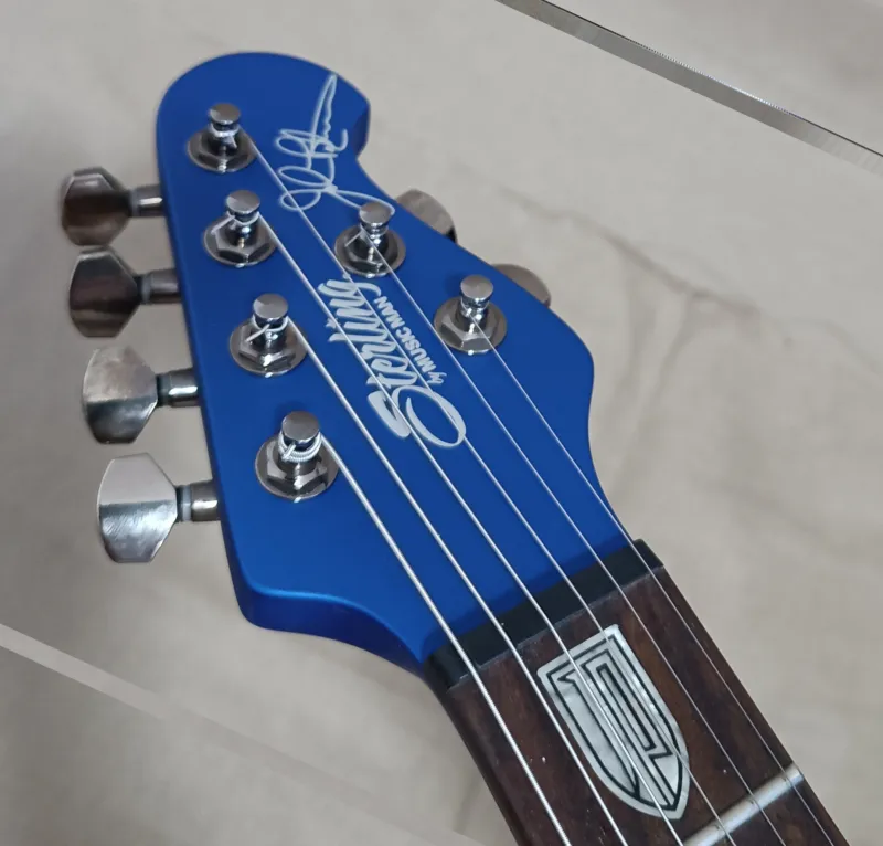 2020 júniusában készült MAJ100 SSP ,Siberian Sapphire, gitár Dimarzio hangszedőkkel. A nyaknál Dimarzio PAF Pro, a hídnál Dimarzio Crunch Lab van. Annak ellenére, hogy két passzív hangszedő van a gitárban, alaphelyzetben is a 12dB boostot biztosító aktív elektronikán keresztül megy a jel. A poti árok fedelén egy mikrokapcsolóval az aktív módról át lehet kapcsolni passzív módra. Azon túl , hogy így elem nélkül is lehet használni a gitárt, a kopasz hangszedők hangja kicsit más, eltűnnek az aktív elektronikára jellemző dinamaikai határok. Gyakorlatilag ez így egy másik gitár. A push-push hangszín potival a hangszedők mindkét módban felezhetők. A push-push hangerő potival - mint az eredeti kapcsolásban is van - a 12dB bosstot lehet bekapcsolni , termászítesen csak az aktív módban. Az átalakítással az olcsó potik helyére minőségi potméterek kerültek beépítésre. Kifogástalan érintők. Profin beállítható gitár, minden tartozékával együtt. 2,8 Kg súly. Sterling by Music Man Delux tok, gyári temolókar, gyári szerszámok. Igány esetén az eredeti hangszedőkkel, vagy mindkettővel. Pompás hangszer.Szállítás