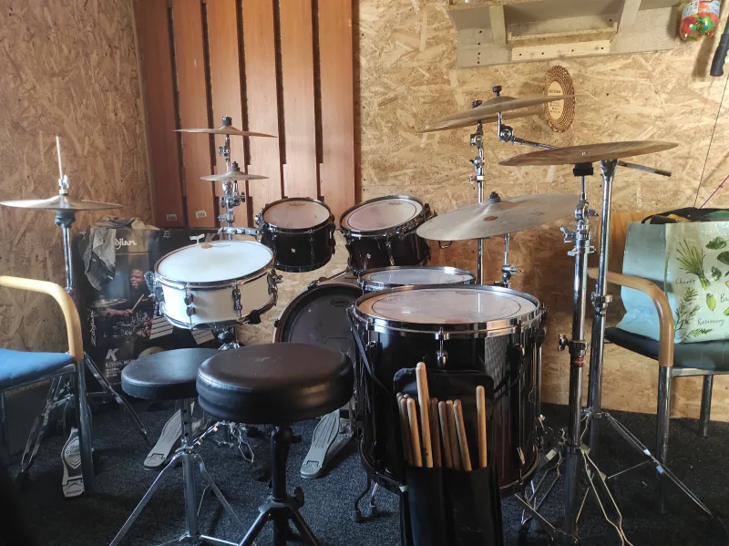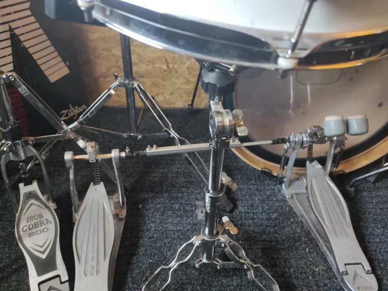 Gyári állványok járnak hozzá (lábcinállvány ,2db gémes állvány a tamtartókkal,pergőállvány, tamtartó lábak) , plusz kiegészítésként 2 Gibraltar állvány, egy Tama 1st Chair dobszék, illetve egy Tama Speed Corba 310-es, duplaláncos duplázópedál.