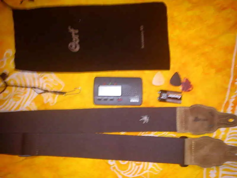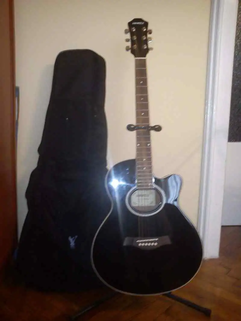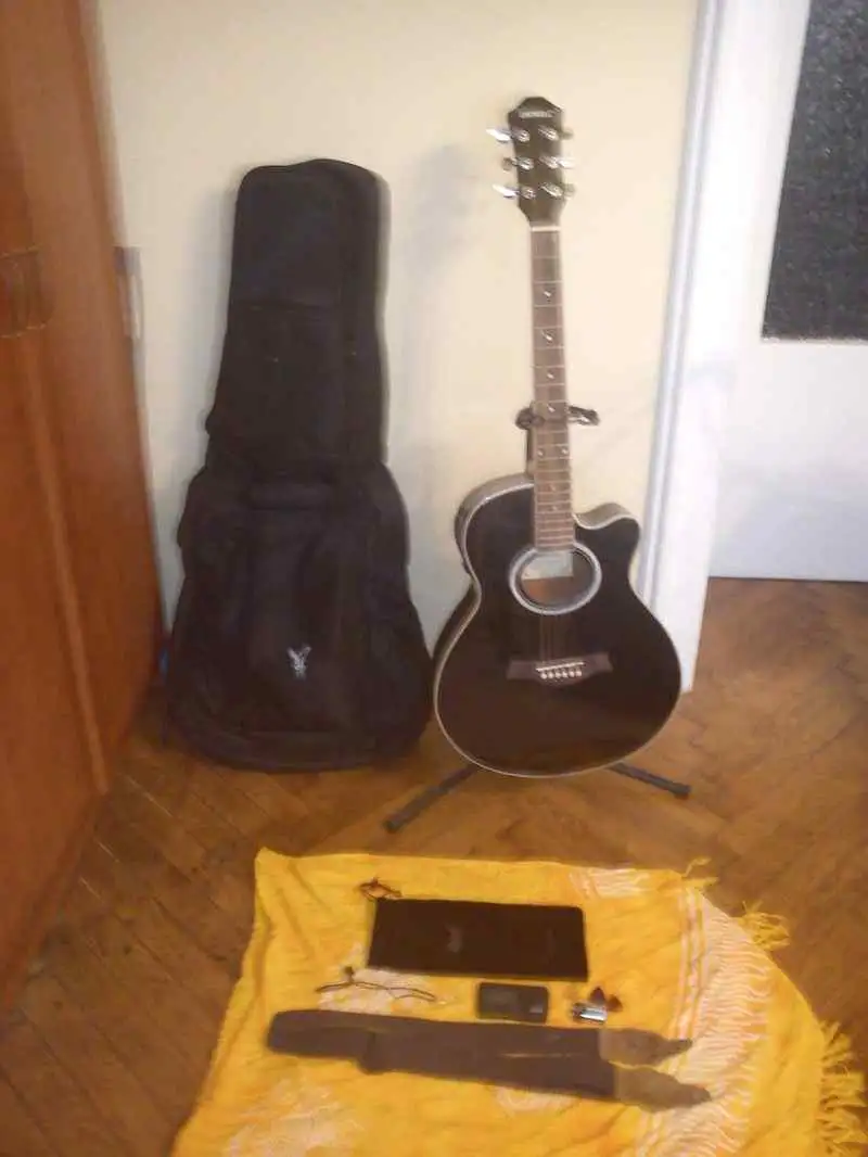 huendeskesEladó egy Uniwell elektroakusztikus gitár aktív elektronikával. a gitárhoz jár egy puha tok (vastag szivacsos),gitárhúr tisztító, ÚJ Korg hangoló, 3db pengető (dunlop,cort,fender), egy összecsukható állvány, egy Vorson egyedi heveder, egy Cort bársony kelléktartó, elem az elektronikába. a hevederhez kiegészítőként egy akasztó ami a nyakba akasztáshoz kell.