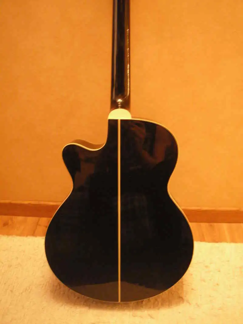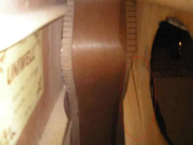 A gitártestben az egyik merevítő rúd megrepedt (az egyik képen bejelöltem) illetve a test alsó részén az előlapot elengedte a ragasztó, ennek mentén kisebb repedés a lakkon.