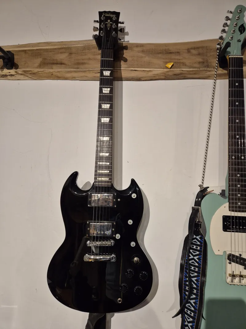 Eladó Vintage gitár, SG fazon, igazi rock gitár, de a hangszehdőnek köszönhetően hozza a jazz, blues vonalat is.