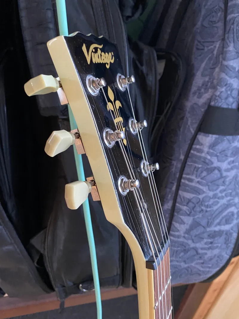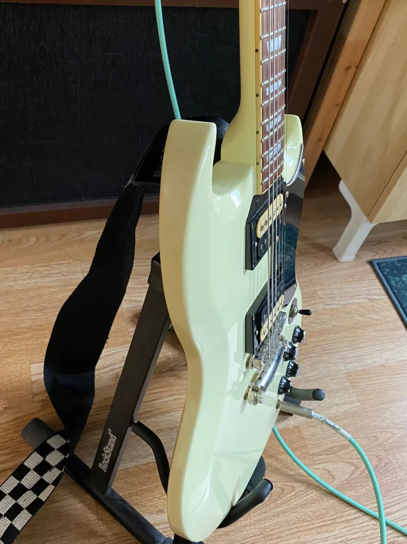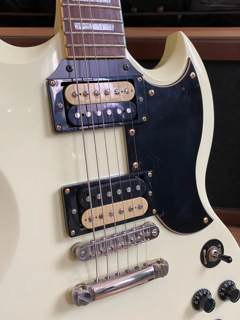 Dögös vintage white/törtfehér SG a Vintage-től. Náluk ezt VS6-nak hívják, a teste inkább az ESP vonalat hozza, viszont a minimálisan ˝offset˝ test miatt egy széles hevederrel plusz bedugott kábellel nincs neckdive, azaz nem hozza az SG-k idegesítő tulajdonságát, hogy ha nem fogod bal kézzel, a fejnehézség miatt bólint a gitár. Magyarul ő ezt nem csinálja. Mahagóni mahagóni (nyak és test), rózsafa fogólap.Aki nem ismeri a Vintage márkát, annak mondom, hogy van ilyen árkategóriájú Epiphone-om, és ez a gitár azt magasan kenterbeveri minőségi kategóriában. Ráadásul ezen a gitáron már minden cserélve, amit cserélnél, minőségi alkatrészekre. Irongear hangszedők (alnico II tesla shark a hídnál - teljesen Slashes hangzás - és egy alnico IV - PAF spec - blues engine-t nyaknál), nézzen utána aki nem ismeri, csak kimagaslóan pozitív vélemény van róluk a neten, nekem is van ezeken felül még számtalan irongear hangszedőm, csak ajánlani tudom. Schaller deluxe hangolókulcsok (nikkel), Gotoh Tune-o-Matic híd és húrláb, szintén nikkel. Az elektronika semmi különös, teszi a dolgát, a potik asszem made in korea, orange drop kondik, a kapcsoló, jack megbízható. A fogólap szép, a bundok rendben vannak. Nyak, fej törve nem volt. Látványos hibája nincs, max apró karcok.