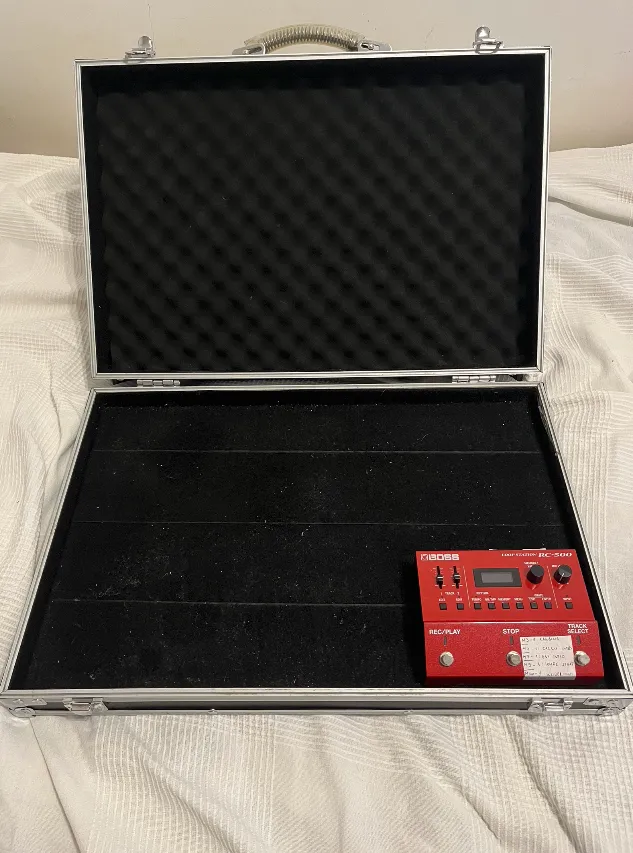 A boardban több pedál is kényelmesen elfér, körülbelül 10 kisebb-nagyobb pedállal használtam. A képeken egy nagyobb méretű BOSS Looper pedállal illusztráltam a méreteket.
