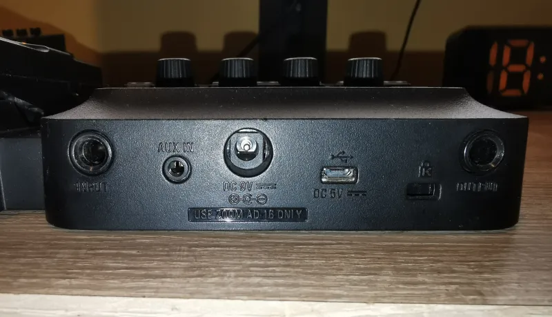 - Bemenet: 6.3 mm TS jack; microUSB (Guitar Lab programhoz); 3.5 mm TRS jack (AUX IN, külső hangforrás csatlakoztatásához)