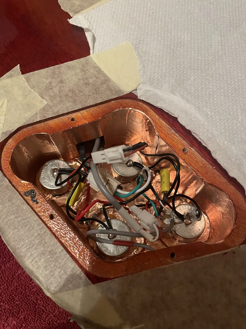Valószínűleg nincs rendben a földelés, multiméterrel lehet ellenőrizni. Rézfóliával a búgást-zúgást nem tudod megszüntetni, zajmentessé akkor teszi a rendszert ha egyébként már rendben van a bekötés. Stageshopban kapsz fóliát, öntapadós. A temusat hanyagold, a fólia réz de a ragasztó nem vezető, így nem alakul ki kötés a darabok között. Kibéleled vele a test üregét, a koptatólap alsó felét, ezek érintkezzek egymással, illetve egy kábellel összekötöd a réz felületét a potin a földeléssel.