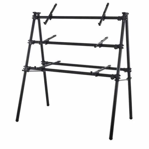Keyboard Stand For 3 keyboards Made of black powder-coated aluminium Height: 140 cm Width: 115 cm Inner width: 105 cm Maximum adjustable depth: 70 cm With hand wheels The lower section, reinforced by a second tube, has a pair of 60 cm long supports and is also suitable for particularly heavy keyboards The other supports are 40 cm long All shelves are height-adjustable and tiltable Stand is foldable for transport, but can also be quickly dismantled Load of lower shelf: Up to 40 kg Load of upper shelf: Up to 15 kg (higher load possible with additional shelf reinforcement as below) Made in Germany Suitable accessories: Additional pairs of shelves, monitor support, micro swivel arm, music stand, laptop shelf and shelf reinforcements (not included) 30 30-Day Money-Back Guarantee 3 3-Year Thomann Warranty Available since July 2018 Item number 443025 Sales Unit 1 piece(s) Keyboard Supports 3
