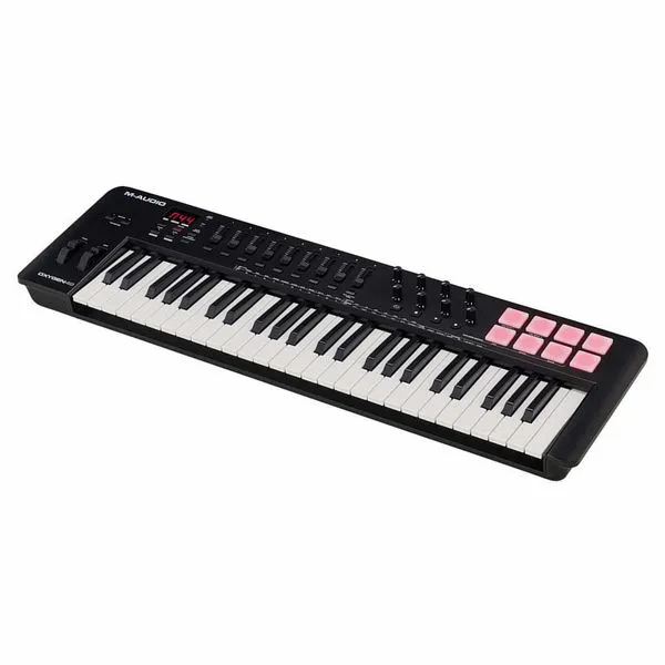 USB MIDI Controller Keyboard With 49 velocity-sensitive keys 8 velocity-sensitive trigger pads with note repeat function 8 assignable knobs Preset and DAW buttons for automatically assigned instruments and plug-ins 9 assignable faders for controlling plug-in parameters Smart Chord & Smart Scale mode Arpeggiator with control for type, octave, gate and swing Transport buttons for DAW control LC display Pitch bend and modulation wheels Sustain pedal input 2USB 2.0 (bus-powered) Dimensions (W x D x H): 814 x 243 x 94 mm Weight: 2.