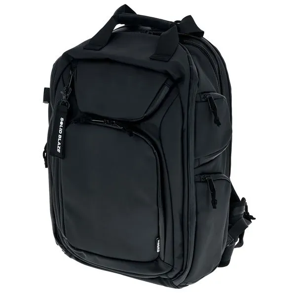 Travel Backpack For professional DJs, producers, live acts, photographers, content creators and filmmakers Water-repellent Padded compartment for a laptop up to 17.0 and a tablet Expandable main compartment with variably positionable hard foam padding and dividers Additional storage space in the front compartment Three large mesh pockets for accessories Special outer compartment for headphones or camera Side compartment with pen holder and flexible lanyard Expandable side compartment with USB dock (power bank not included) Padded back panel with secret compartment Ergonomically shaped backpack straps Detachable padded hip belt and adjustable chest closure Lockable YKK AquaGuard zipper (padlock not included) Trolley handle Suitable for hand luggage Sustainably made from 120 recycled 0.