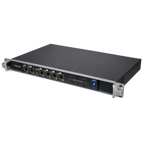 Personal Monitoring System Hub With PoE remote power supply for up to 4 DP48 personal mixers and compatible stage boxes Cascading of multiple hubs and stage boxes possible via AES50 IN and THRU Channel naming and group assignments can be controlled via compatible M32 consoles Midas DL8 stage boxes can be connected and powered from ports Supports remote control of multiple DP48s StageCONNECT output with phantom power for other StageCONNECTs Neutrik etherCON connectors Operates with a CAT5e cable of up to 80 m Integrated Switched-mode power supply AES50 sync master thru: 2x RJ45 AES50 remote outputs: 4x RJ45 (PoE) USB connection AES50: 48 auto channels, 44.1 48 kHz sampling rate StageCONNECT: Audio channels 16 in 16 out Dimensions (H x W x D): 50 x 482 x 291 mm Format: 19 1 U Weight: 3.