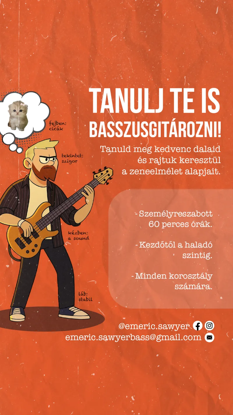 Személyre szabott 60 perces órák kezdőtöl a haladó szintig, ahol segítek a hangszer megismerésében, különböző játéktechnikák (2 ujj, 3 ujj, slap, tapping, pengető) elsajátításában és a zenelmélet és kedvenc dalaid megtanulásában stílustól függetlenül.