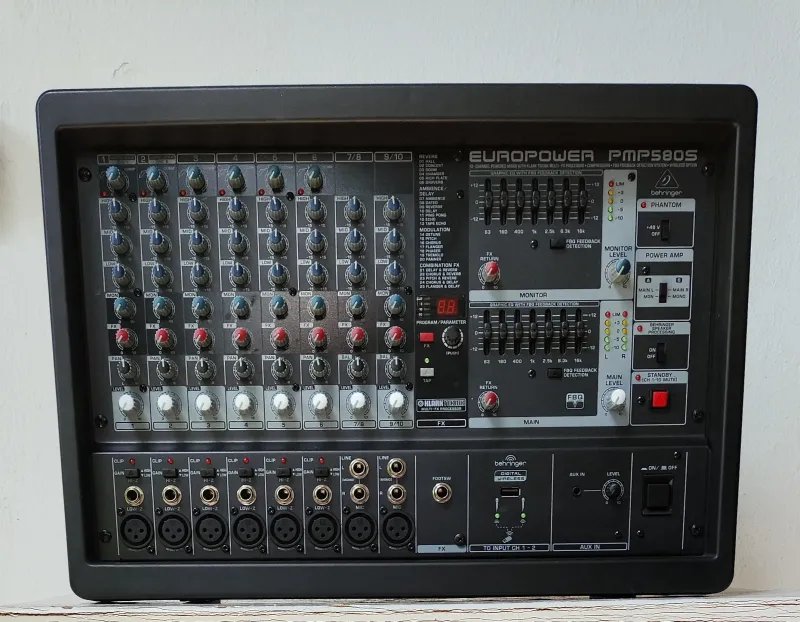 BEHRINGER PMP580S keverőerősítő, újszerű állapotban, dobozában eladó.2x250 Watt/4 Ohm. 6 mono, 3 sztereo csatorna. 8 mikrofon, 10 (+1, 3.5 mm-es jack-es Aux) vonal bemenet. Klark Teknik - ritmussal szinkronizálható - digitális effekt processzor. A mono csatornákon kompresszor. A Master és a Monitor kimeneten 7 sávos grafikus EQ. A kimeneteken kapcsolható digitális gerjedésgátló.