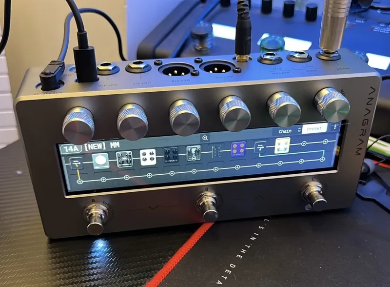 Demozásra használt eszköz, totálisan új.A Darkglass Anagram egy erőteljes basszus multieffekt pedál, és a ˝rögzítés˝ a fizikai eszközök (erősítők, pedálok, hangládák) Neural Amp Modeler (NAM) profiljának létrehozását és az Anagramra való betöltését jelenti a Darkglass Suite alkalmazáson keresztül , hogy a rugalmas jelláncokon belül használhassa, bár maga az Anagram nem egy rögzítőeszköz, mint egy Kemper vagy Quad Cortex; külsőleg rögzítesz és importálod. Összetett effektláncokat építhetsz vele, beleértve ezeket az importált NAM profilokat, párhuzamos útvonalakat és beépített Darkglass effekteket, mindezt az érintőképernyőn és a Darkglass Suite segítségével kezelve a tökéletes hangzásformálás érdekében.