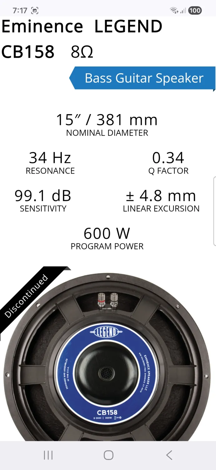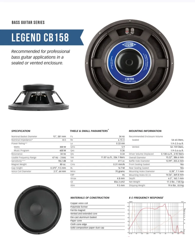 Eladó 1 db újszerű, gyári állapotú (nem javított), Eminence Legend CB158 típusú basszusgitár hangszóró.