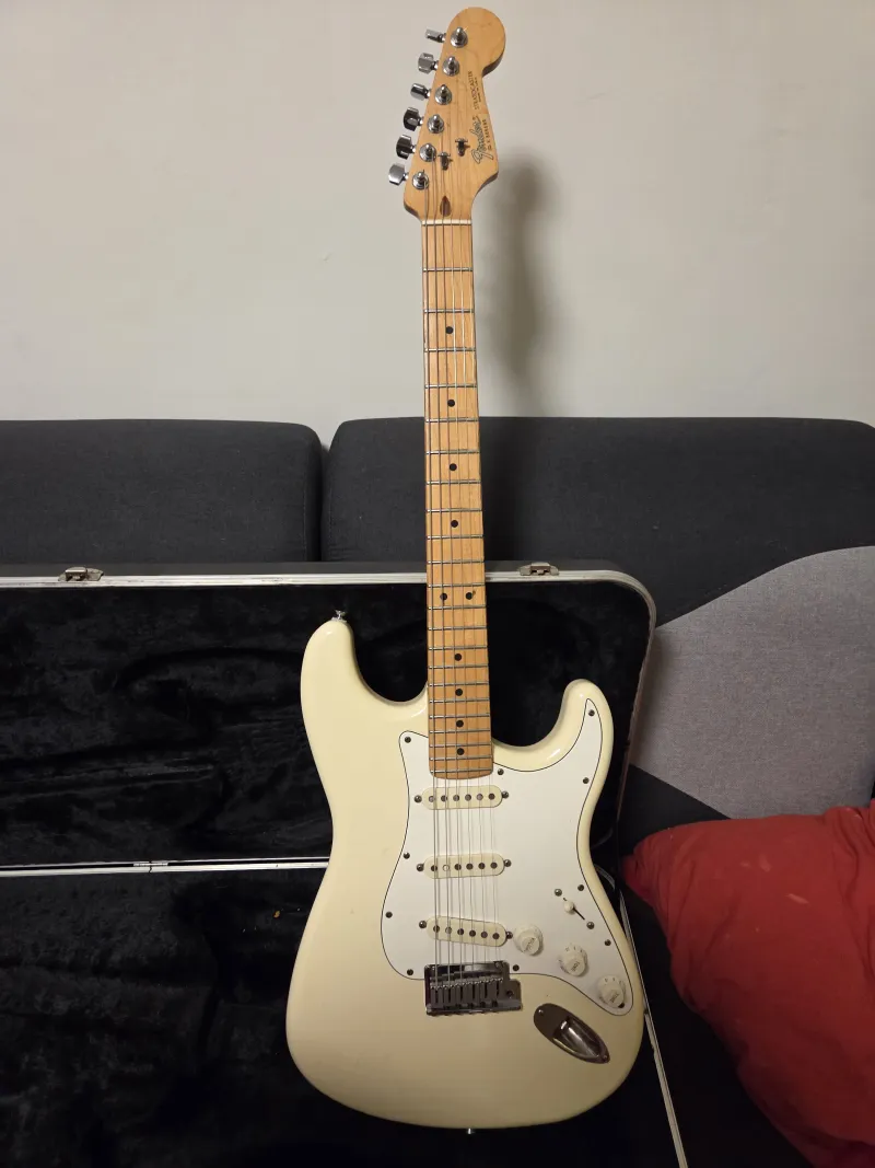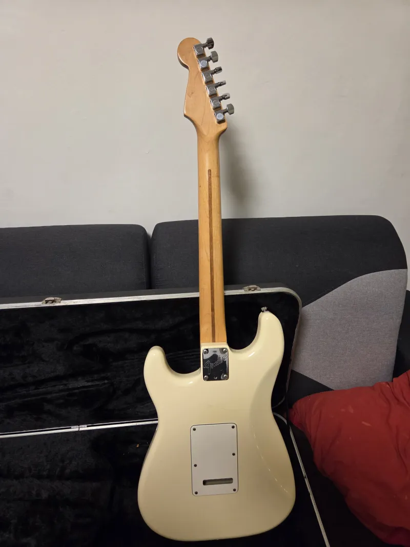 Eledo Fender Stratocaster American Standard usa 1988, Olimpic White színben.Hangja tipikus, mar csak Hendrix hianyzik róla.38 éves, beérett hang, kényelmes nyak, mokolas mentes gitar.Prepojená recenzia