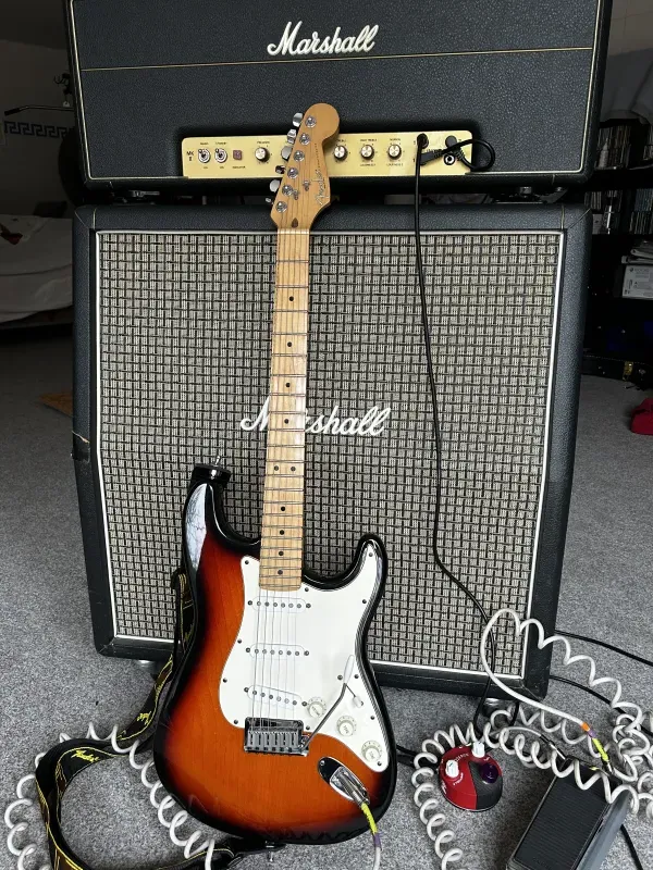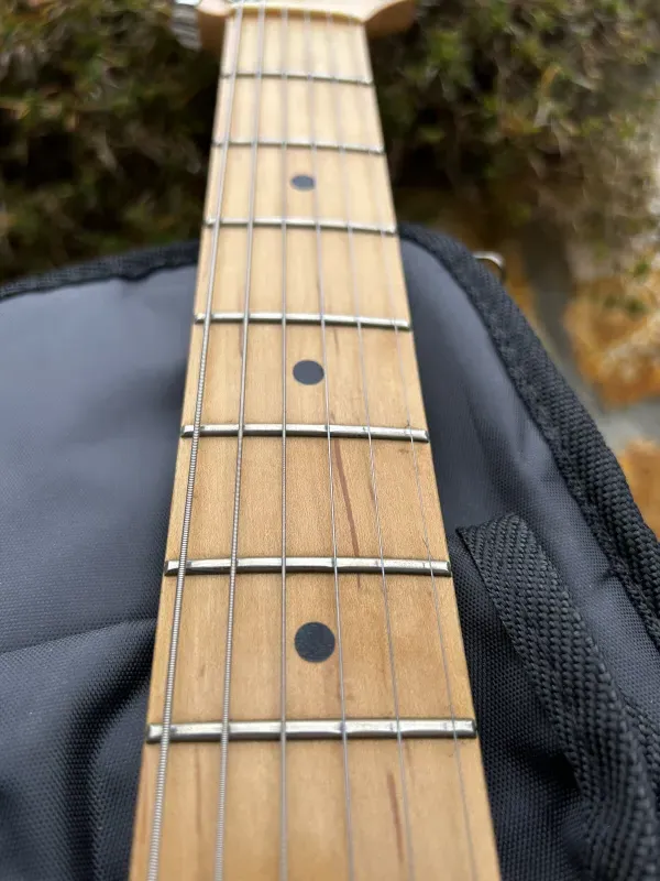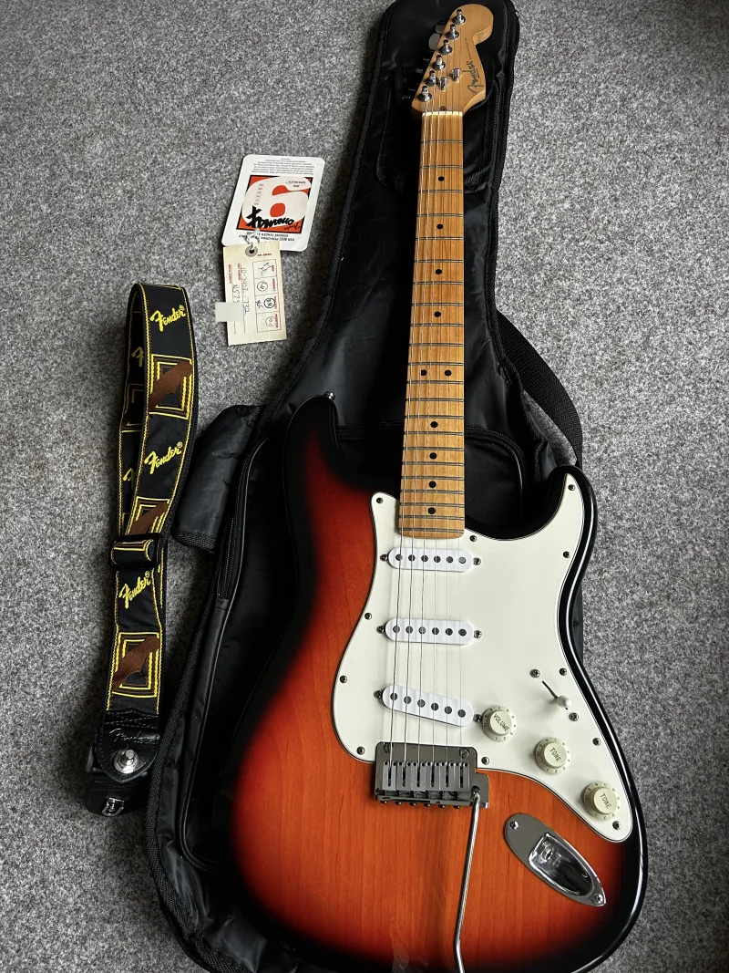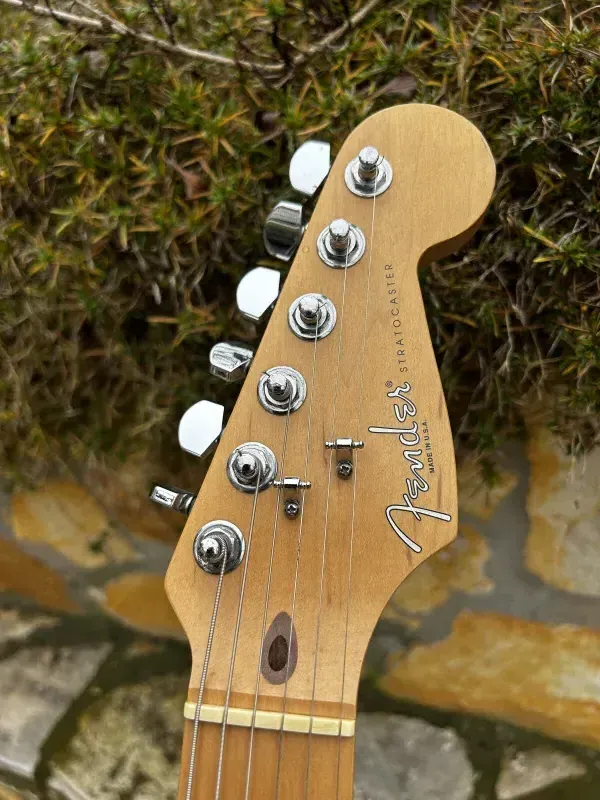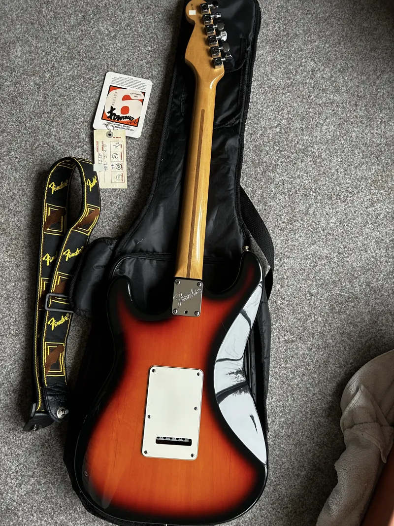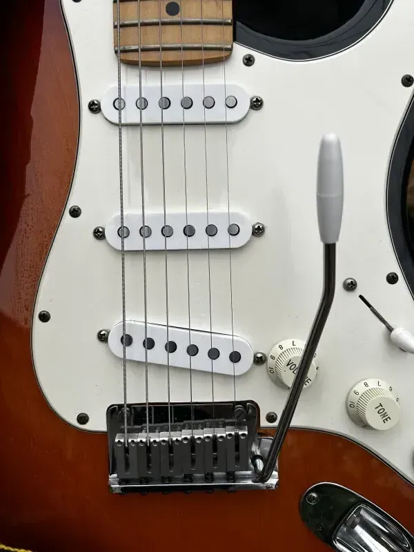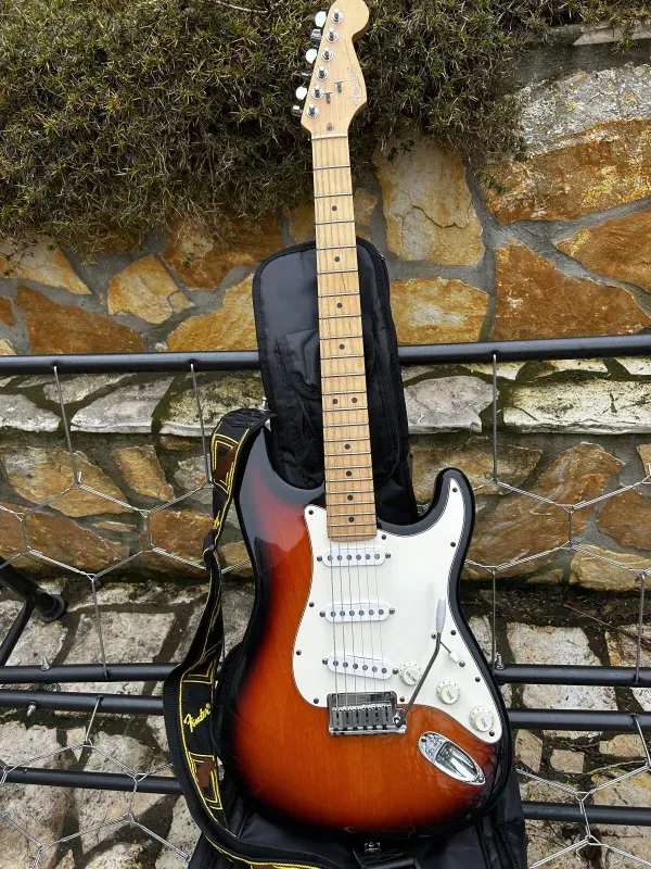 Fender Stratocaster USA American Standard (1995) Elektromos gitár. Csodaszép sunburst. Nagyon jó és tiszta állapotban. Egyhe lakk kopás a nyakon egy helyen (lefotóztam). Minden 100% eredeti. Fender strap lock-os hevederrel, puha gigbag-el, termolo karral. 10 éve nem használom, elötte sem sokat. Alul gyárilag dual tone potméter van (kettö tone egymás allat egybeépítve). 30 éves de mintha új lenne.Csere nem érdekel.