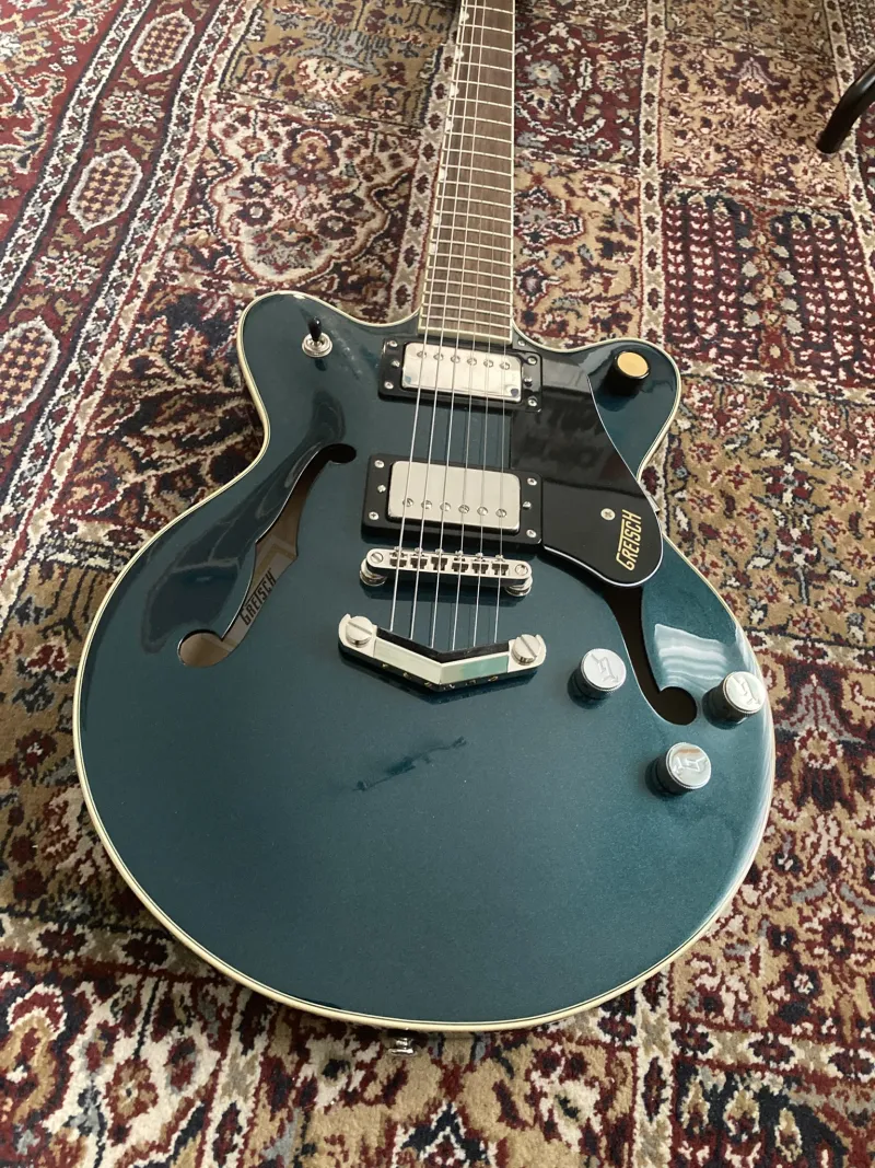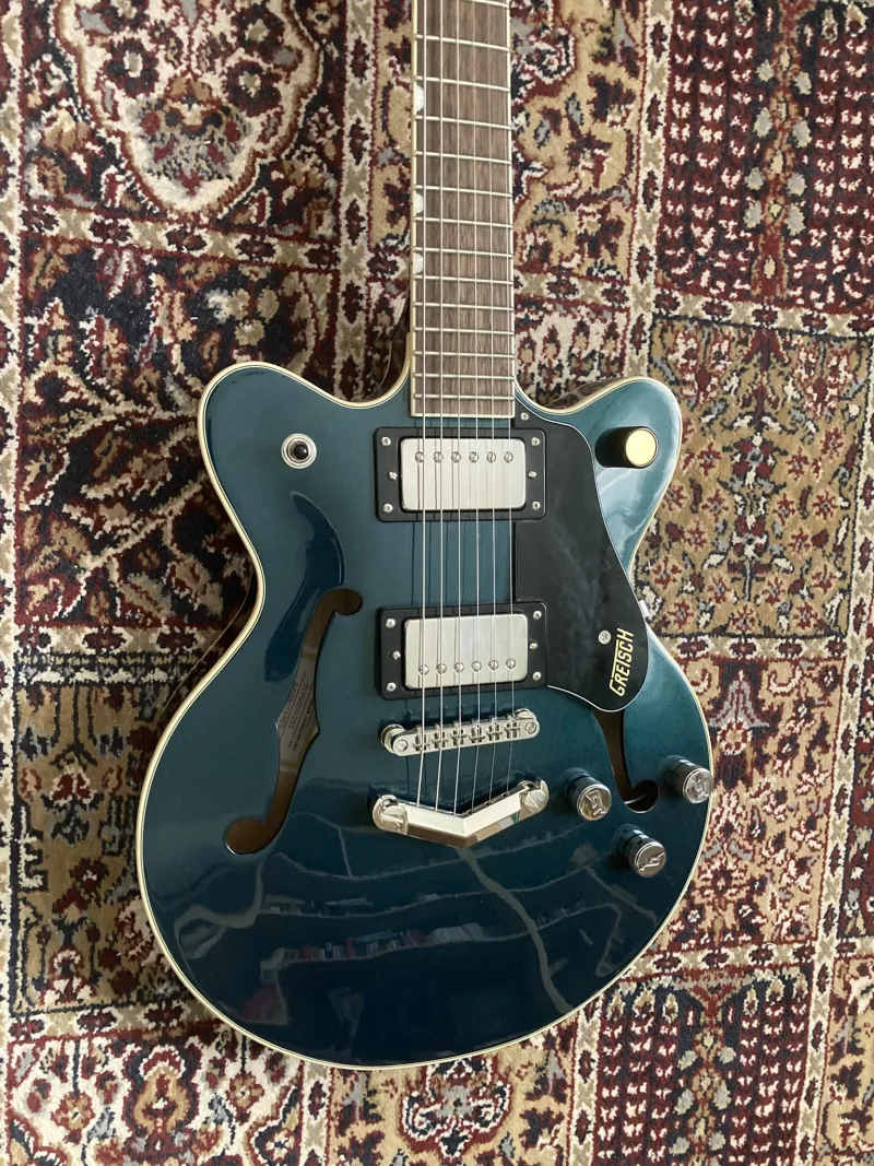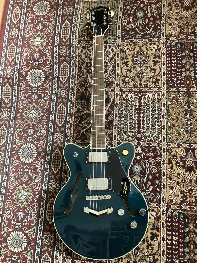 Alig használt Gretsch G2655 Streamliner center block gitár midnight sapphire színben. Felezhető Bare Knuckle The Mule szettel, de az eredeti Broad`Tron BT-3S szettet is adom a mellé. Hagyományos Gretsch fém potisapkákkal, de szintén adom az eredetieket. Alacsony húrnyomés, Elixit 11-49-re beállítva.Prepojená recenzia