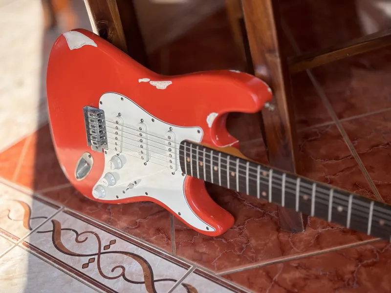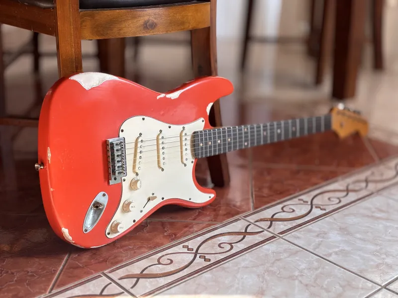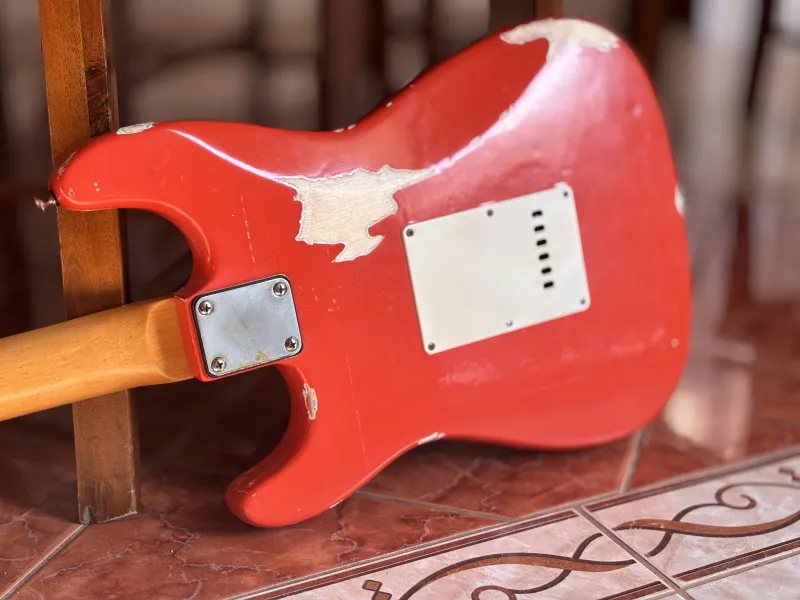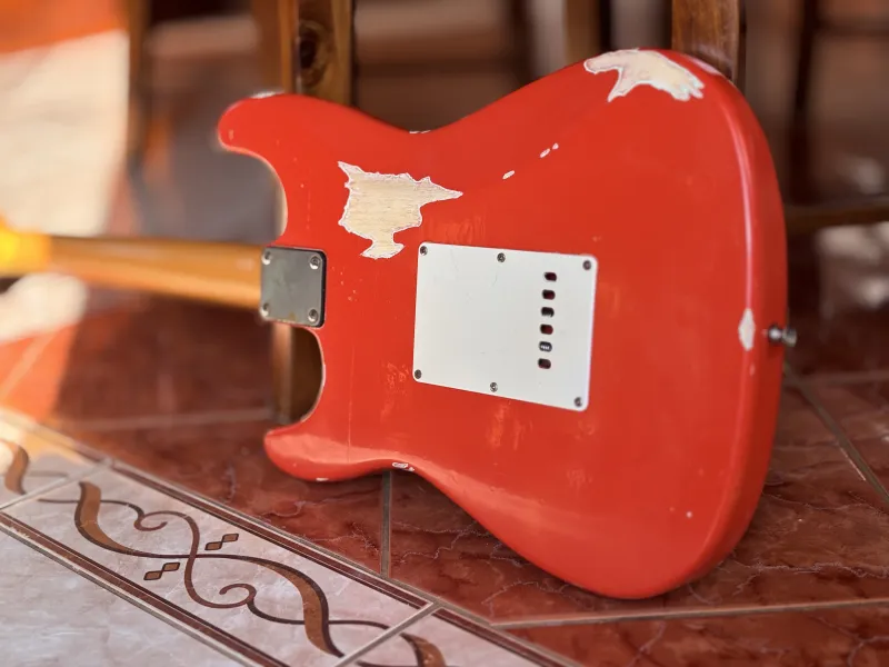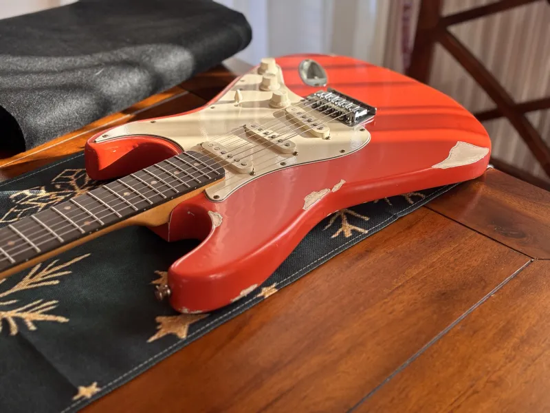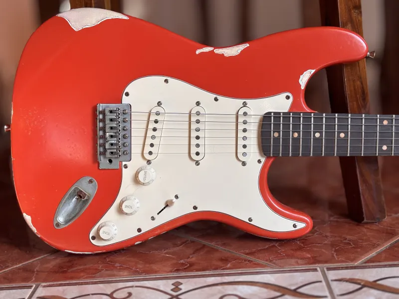 1962-es Stratocaster mintájára készült, kézzel készített gitár. Fiesta Red heavy relic nitro lakkozás, éger test, rózsafa fogólap, kézzel tekercselt alnico5 hangszedők. Nagyon rezonáns, kényelmes hangszer.Doručenie