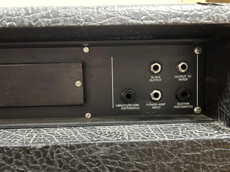 A hátán van Power-Amp Input, Slave Output, Output To Mixer (minek), illetve lábkapcsoló bemenetek (Vibrato/Reverb és Sustain - ezeket nem szereztem be az évek alatt). Ha a hangerő nem lenne elég, van Output 2 csatlakozó is, 4-15 ohmig mindenki halálra van ítélve.