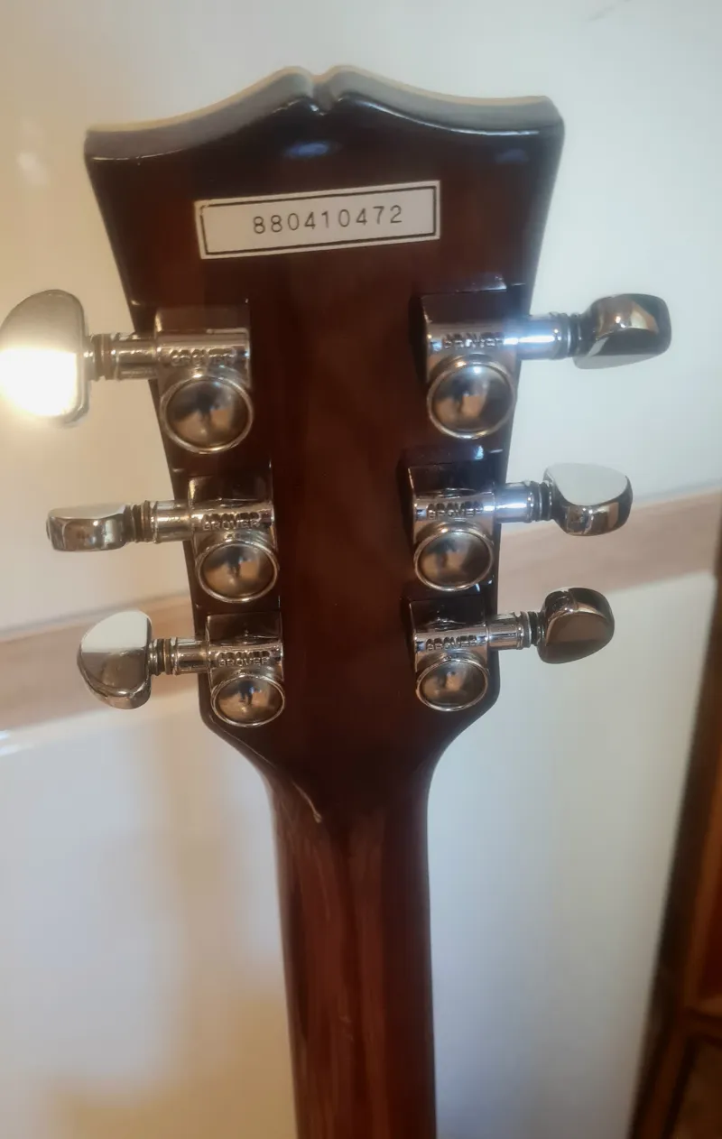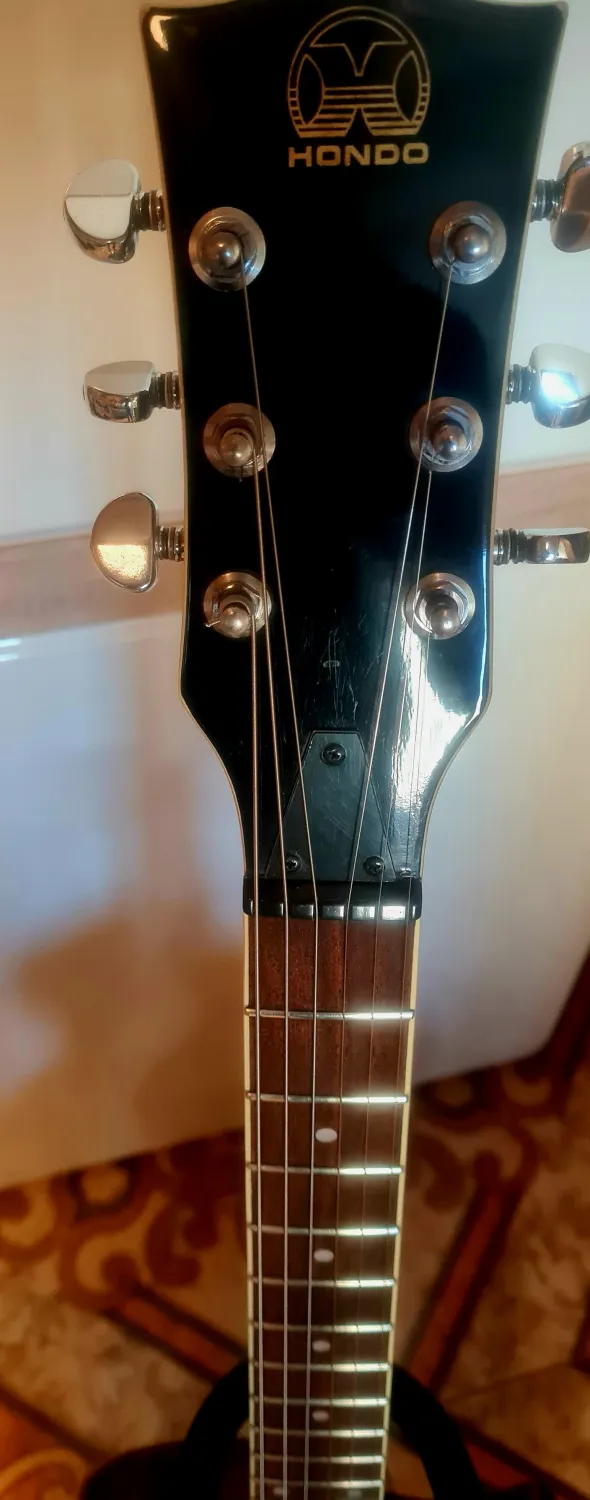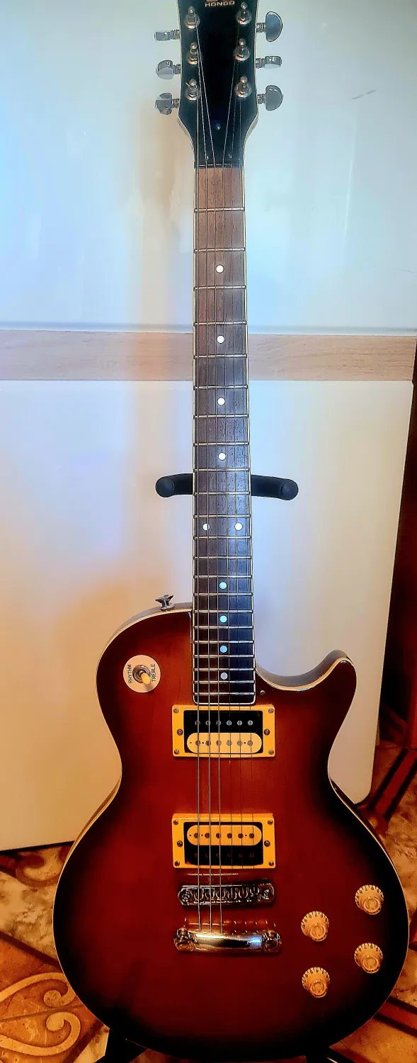 Hondo Deluxe Les Paul 1988/ koreai, igazán szép állapotban, új D`addario 10-52 húrokkal szerelve, kaménytokkal!Különlegesen kellemes tónusú hangszedők, mahagóni test, Grover kulcsok, bund kopás kb 0%!