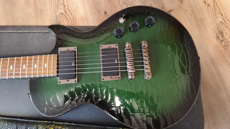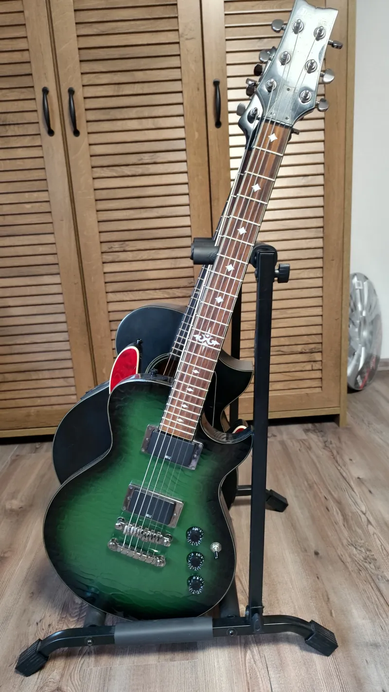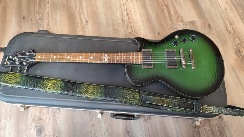 Eladom vagy basszus gittárra cserélem ezt az Ibanez ART 300 - as Zöld kajmán színű gitárt. Gyári színazonos pántjával. Az ART300 egyedi jellemzője a texturált juharfa tető, amely kajmánbőrre hasonlít. Egyéb jellemzők közé tartozik a mahagóni test, amelyhez egy betétes mahagóni nyak tartozik, 22 érintős rózsafa fogólappal, szegélyezéssel és gyémánt alakú gyöngyházfényű pozíciójelzőkkel. Az alkatrészek közé tartozik a két Ibanez aktív LoZ humbucking hangszedő, amelyet két AA elem táplál, egy Tune-o-matic stílusú Gibraltar III híd Quik Change III húrtartóval és fekete sebességszabályozókkal. Tizes Elixír húrral, beállítva. Békéscsabán lehet megnézni, kipróbálni.Prepojená recenzia