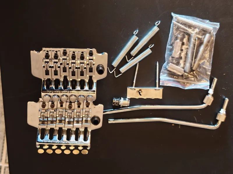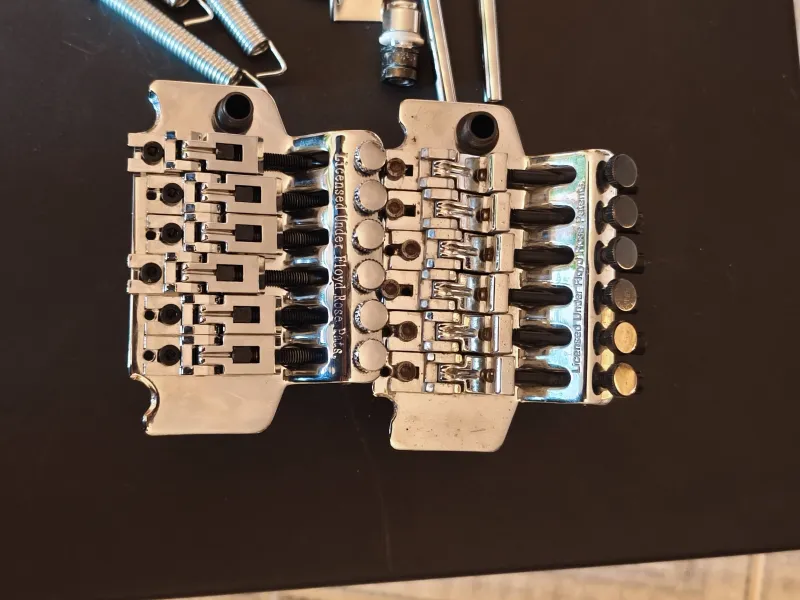 RG270-ből kiszerelt tremoló. Standard Floyd rose méretek. A tremoló mellé jár még a 3 rugó, a tőkecsavarok, és a rugó tartó lap is (nem tudom, mi a szakszó rá). Van még egy szett kínai Floyd rose méretű tremoló, ez teljesen kompatibilis az Ibanezzel (ezt is adom, ahogy a képeken látszik, itt is minden megvan). Vagyis az ár a kettőre együtt vonatkozik.Doručenie