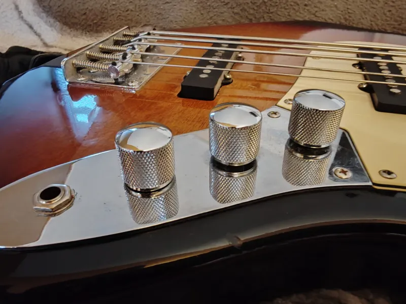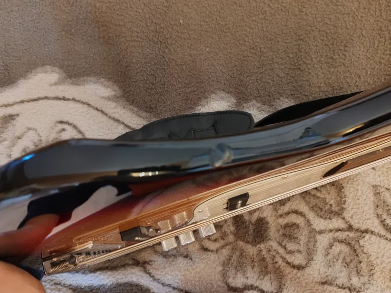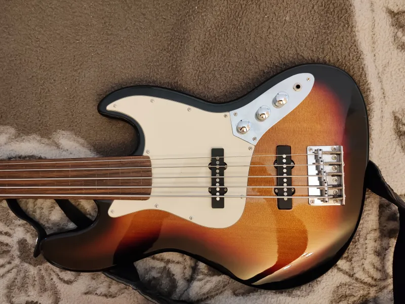 Eladó bund nélküli 5 húros basszusgitár. Elektronikája új, húrokat cserélni kell rajta. Kisebb sérülések vannak rajta ütődéstől amit lefotóztam, ezen kívül nagyon szép állapotban van. Évek óta nincs használatban, már nem is tervezem. Nyakpánt van hozzá. Nehéz súlyú gitár (aki esetle nem ismeri).Fretless 5 strings Johnson by AXL for sale with new electronic. Strings need to change. I haven`t used it since years and I am not going to, this is why it is for sale. It is in a good condition and beautiful, but some damage you can see on it on the photos. It is very heavy. With guitar strap.