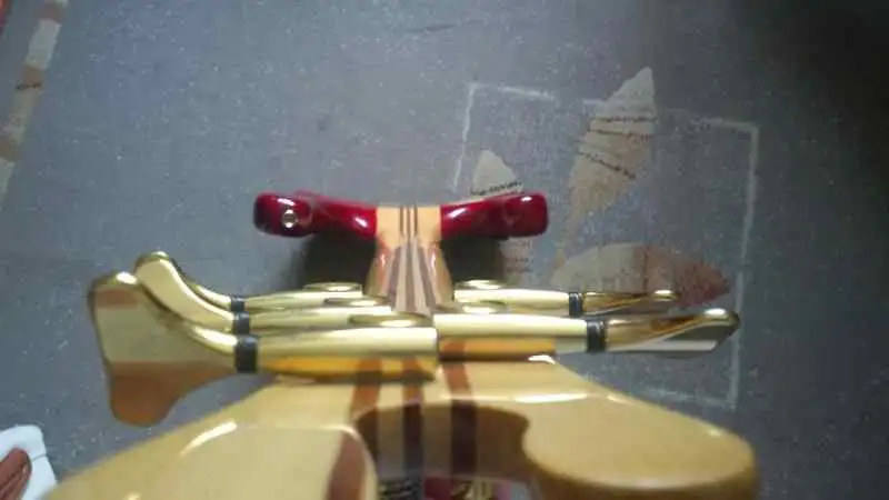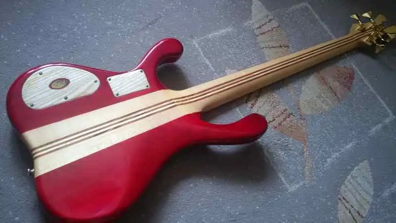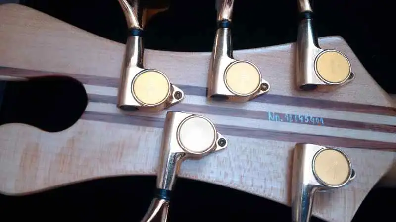 Ladicie mechaniky Gotoh, ohýbané telo z jaseňa, vrchná doska z javora, krk cez telo, dvojitá výstuha krku, zlaté kovanie.