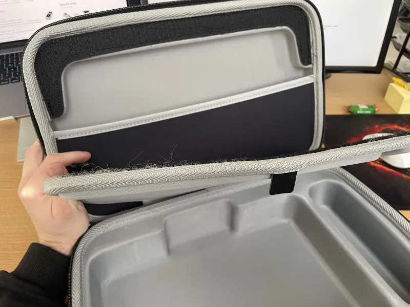 Nem tudom mit írhatnék róla még, nem tud mozogni benne a pedál egy picit sem, van benne egy tépőzáras tároló is, én oda tettem az összes kábelt, amit próbákon használtam, külön hely van a pedál tápjának is, összességében nagyon praktikus táska.