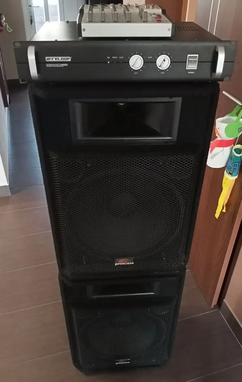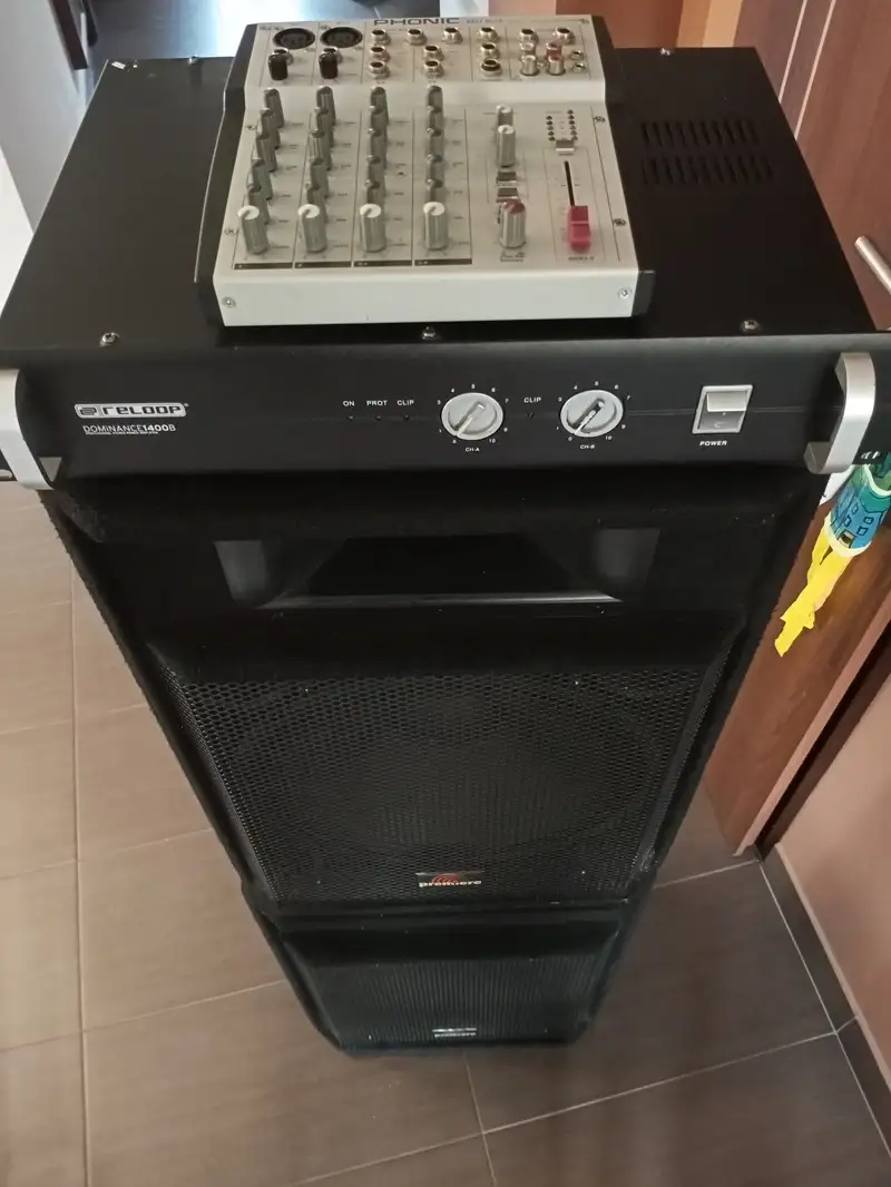 Eladó komplett PA hangrendszer.Reelop 1400B végfok + Premier 6x640 watt hangfalpár + Phonic MU802 , 6 csatornás keverő, minden kábelével, tartozékával a fotókon látható nagyon szép állapotban!