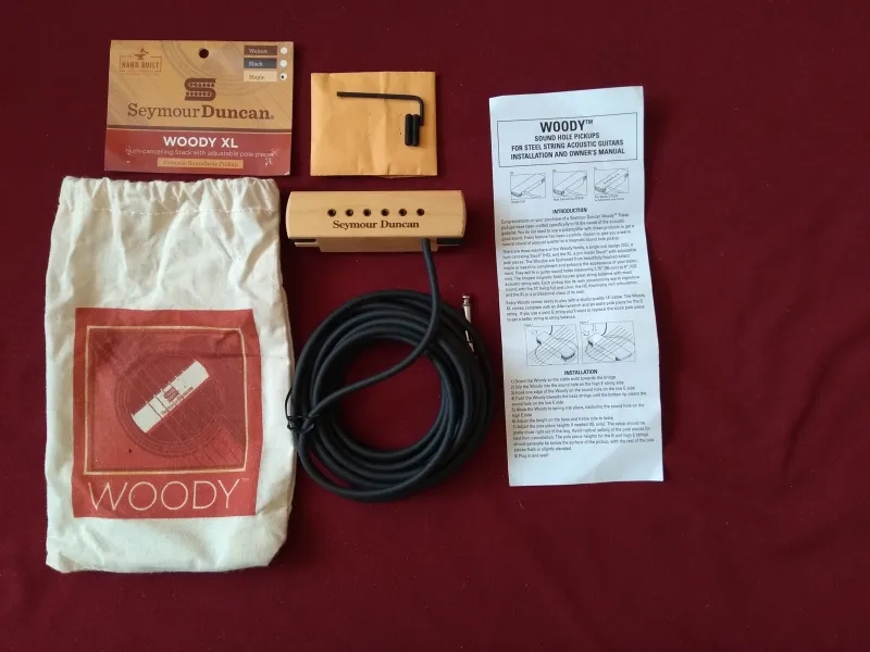 Akusztikus gitárhoz hanglyuk elektromágneses hangszedő a Seymour Duncan Woody sorozatból:94 mm-től 100 mm-ig terjedő hangnyílásokhoz való rögzítés, juharfa ház, függőleges humbucker (zajmentes), állítható pólusokkal.