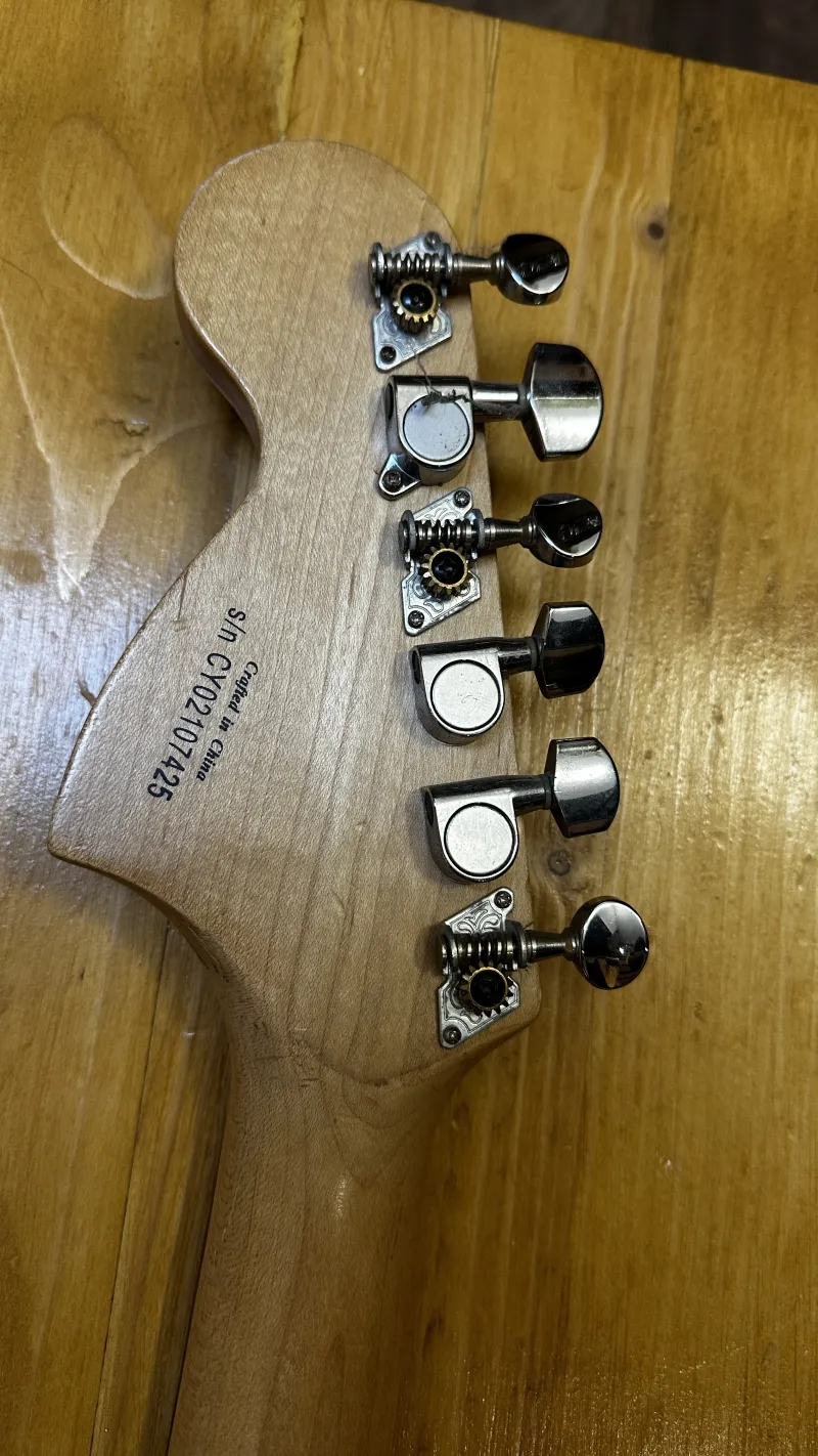 Squier By Fender stratocaster használatból adódott kopásokkal, ezeket fotóztam.2 db húrfeszítő cseélve lett nem ugyan olyan de jól működik.