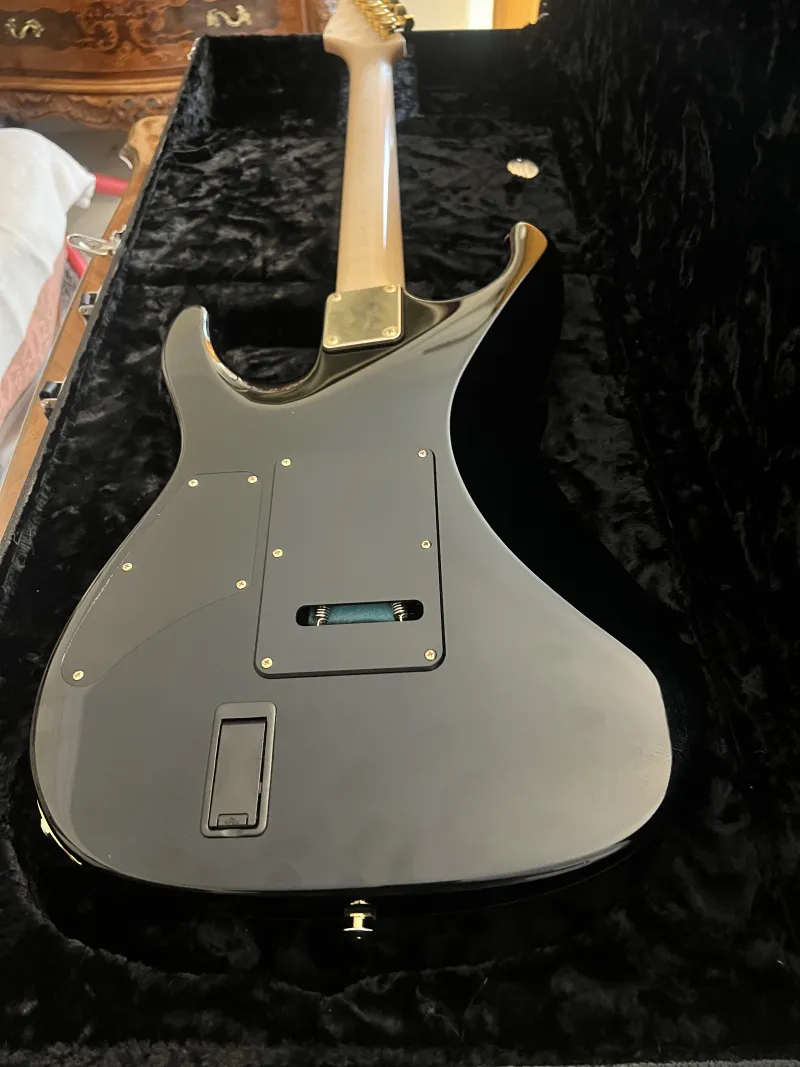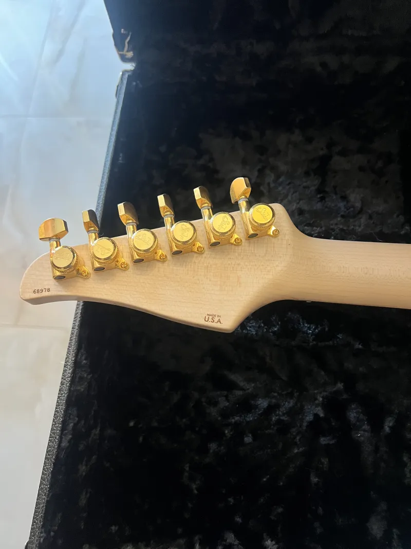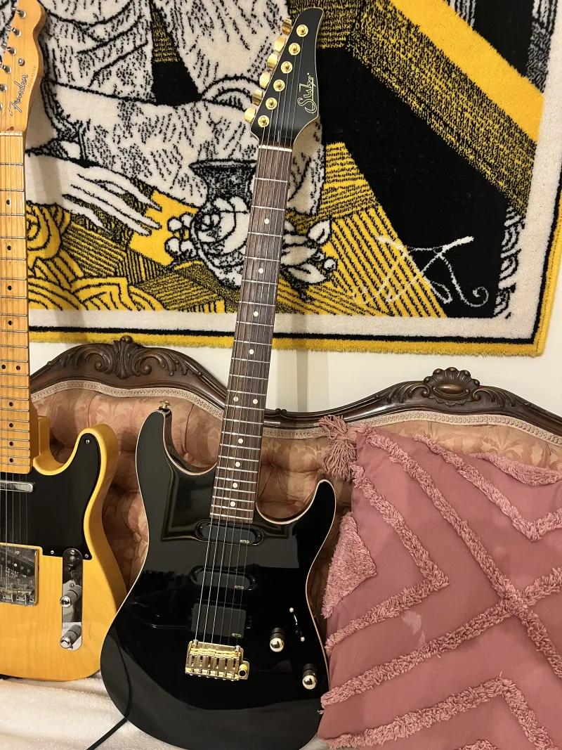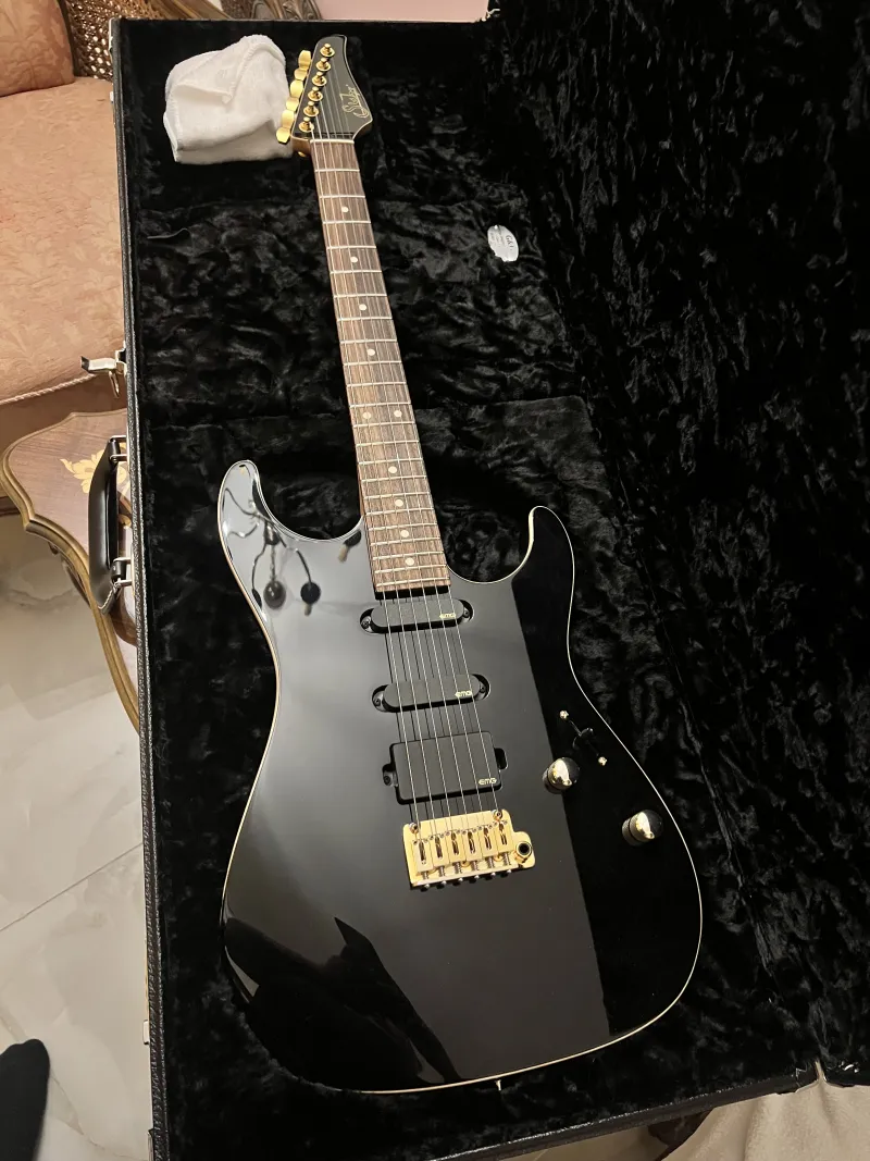 A fekete Suhr Standard Legacy 2021 Limited Edition a klasszikus Strat formát ötvözi a legmodernebb gitártechnológiával. A test okoumé fából készült, juhar tetővel. A juhar nyak indiai rózsafa fogólappal rendelkezik, 10 és 14 hüvelyk közötti kompenzált rádiuszsal. A magasabb regiszterekben lapított fogólap megakadályozza a húrok zümmögését alacsonyabb nyomáson. A rozsdamentes acél érintők kivételes játszhatóságot és tartósságot biztosítanak. A hangszedők HSS konfigurációban helyezkednek el: egy EMG 85 humbucker a hídon és EMG SA single-coil hangszedők a középső és a nyak pozíciójában. A tremolo egy japán Gotoh 510 acél fejjel. A hangolók Suhr típusúak, zármechanizmussal. Ennek a gyönyörű gitárnak az összes szerelvénye aranyozott. A gitárhoz egy deluxe prémium keménytok tartozik.