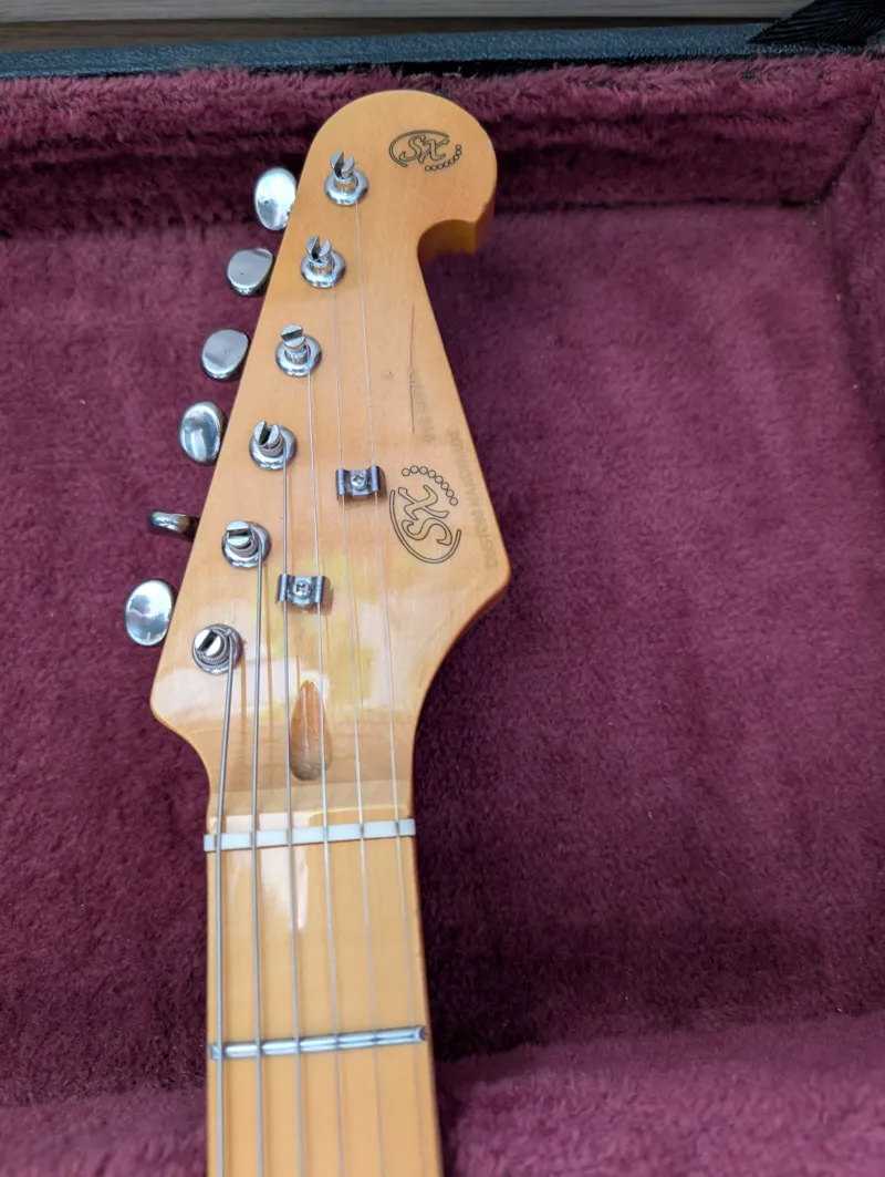 SX Stratocaster eladó. Amerikai Hársfa test, juhar nyak és fogólap. A fehér koptatót gyári Fender 3 rétegűre, a gagyi elektronikát normálisra cseréltem. Felületi hajszál karcok előfordulnak, de összeségében szép. Frissen húrozva és beállítva Ernie Ball 9-46 készlettel.- Gyári tokot